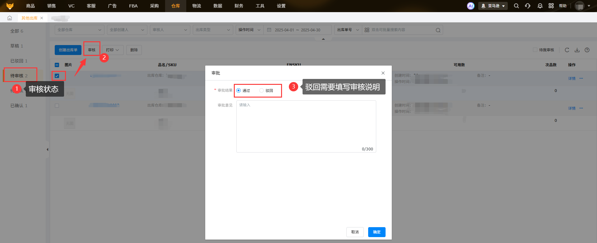 (2)创建的出库单会进入待审核,审核结果是通过、驳回,驳回需要填写审核说明;(注意,未开审核权限的子账号,只能看到自己创建的出库单在待审核里)