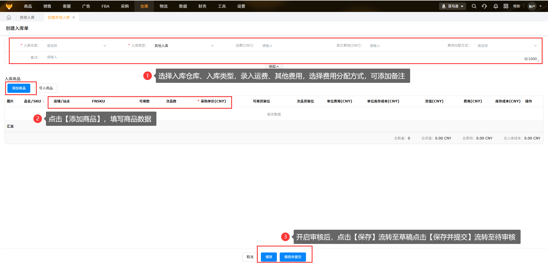 注:录入运费和其他费之后,选择不同的费用分配方式,按对应的分配方式均摊到入库的产品单位费用中;和填写好的商品价格一并算入入库成本。