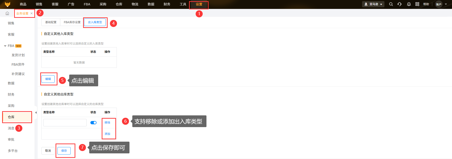 在【设置】-【业务设置】-仓库-出入库类型设置页面,点击编辑可以添加入库类型,点击保存即可。