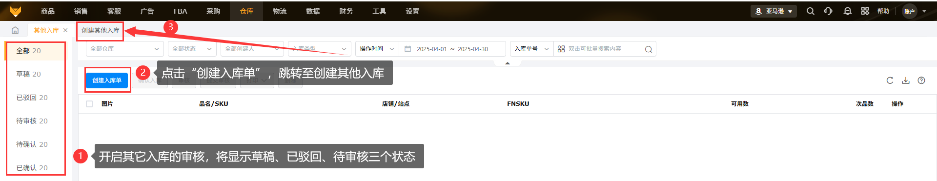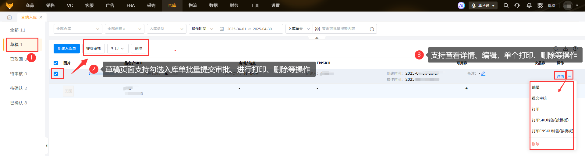 创建入库单后点击“保存”,入库单流转到草稿。该状态下支持提交审核、打印等操作。