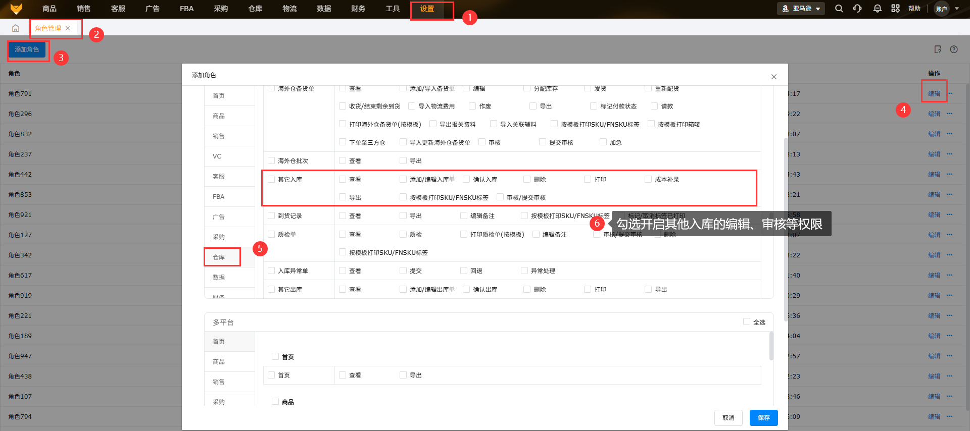 在【角色管理】中开启其它入库权限。