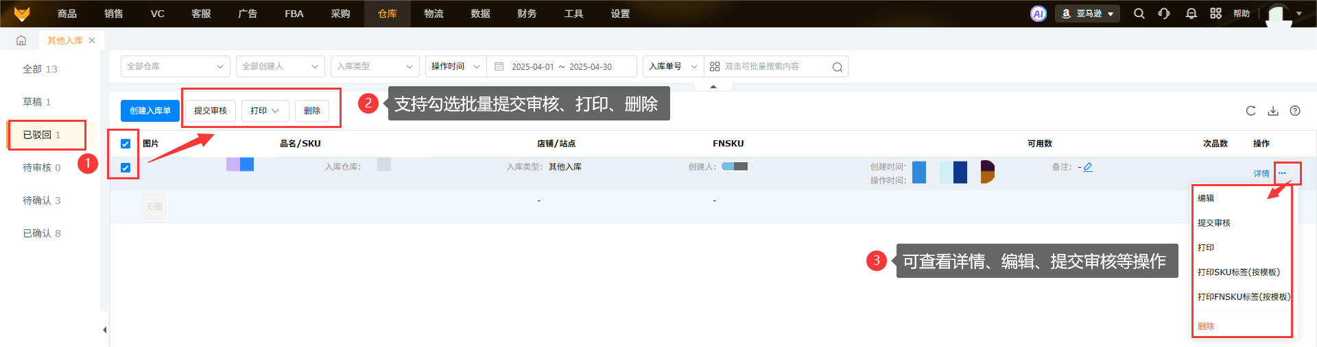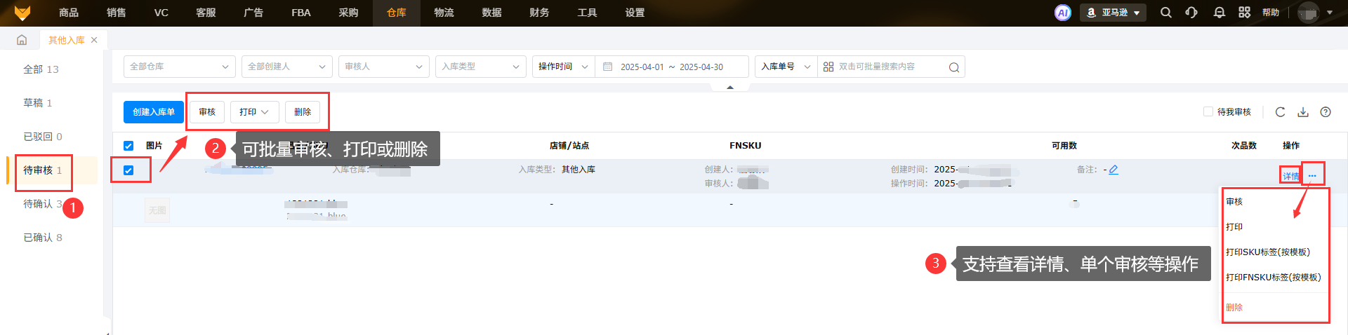 开启了审核流程,创建入库单后点击“保存并提交”流转至待审核,该状态下支持审核、打印、删除等操作。