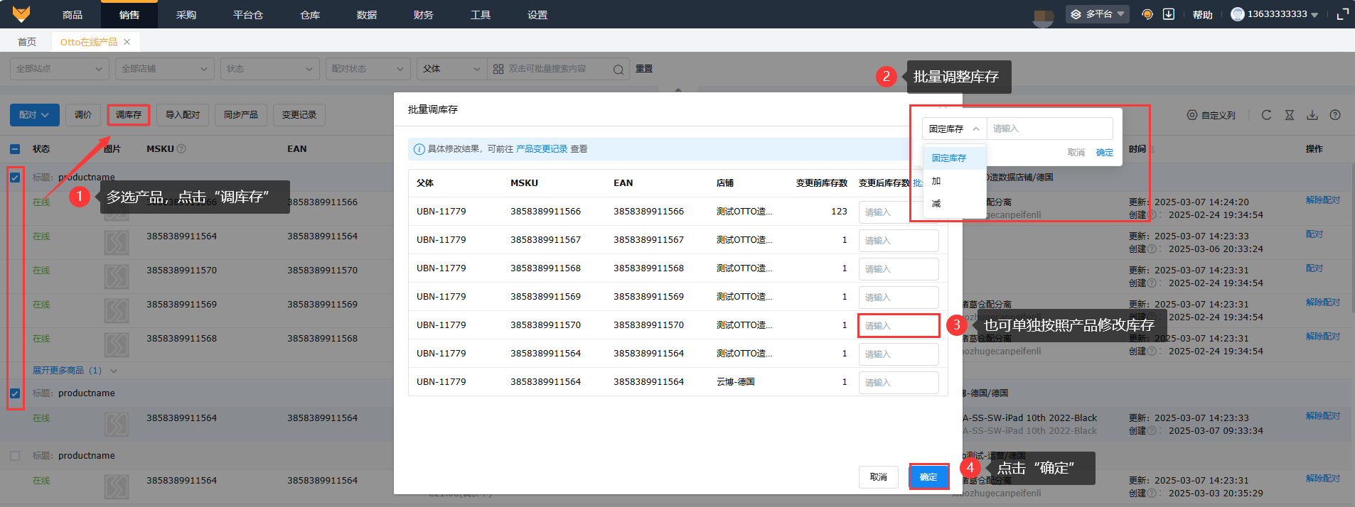 多选要修改的产品,点击“调库存”,调库存可以批量按照某个固定值直接调整,或者是在原来库存基础上加或者减多少;
