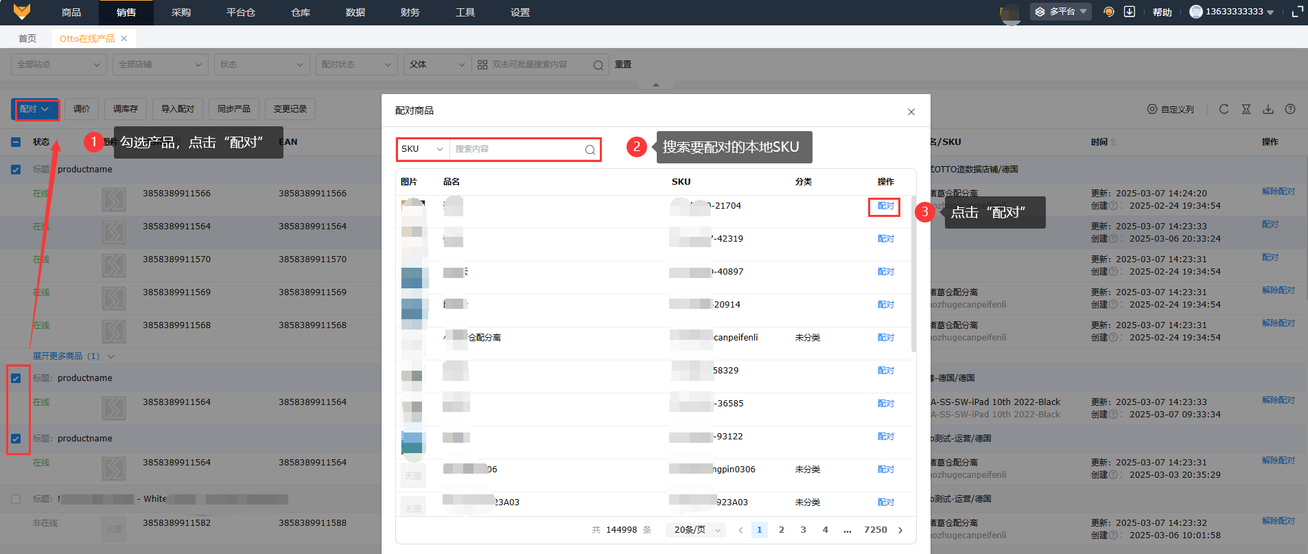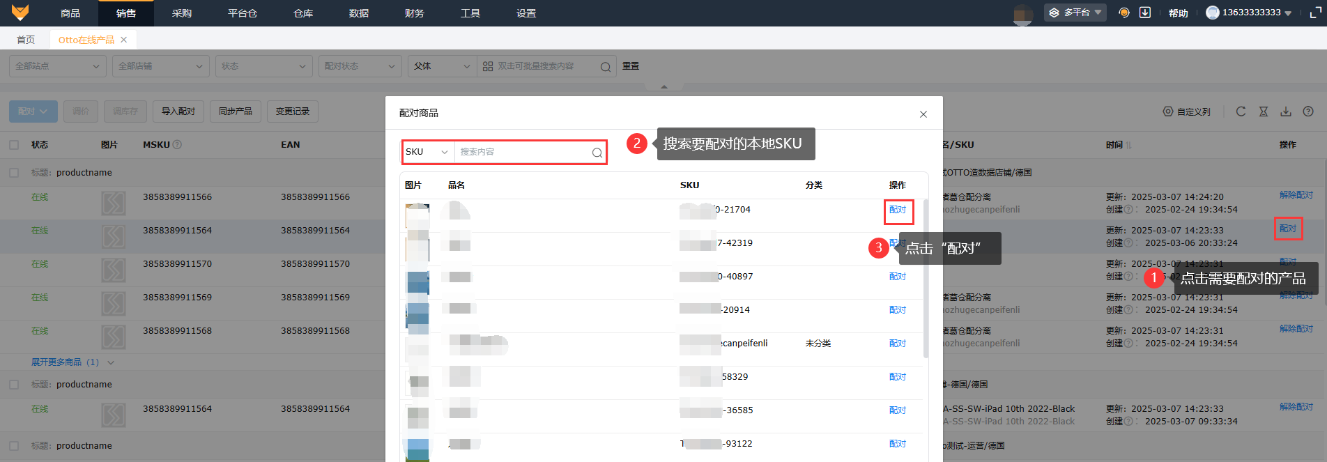 到多平台模式下,进入【销售】-【Otto在线产品】页面,支持按照站点、店铺、产品状态、配对状态和MSKU等快速筛选查看产品数据。