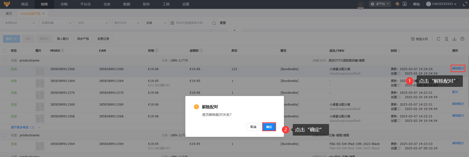 选择产品进行解除配对,解除在线产品与本地商品的配对关系。