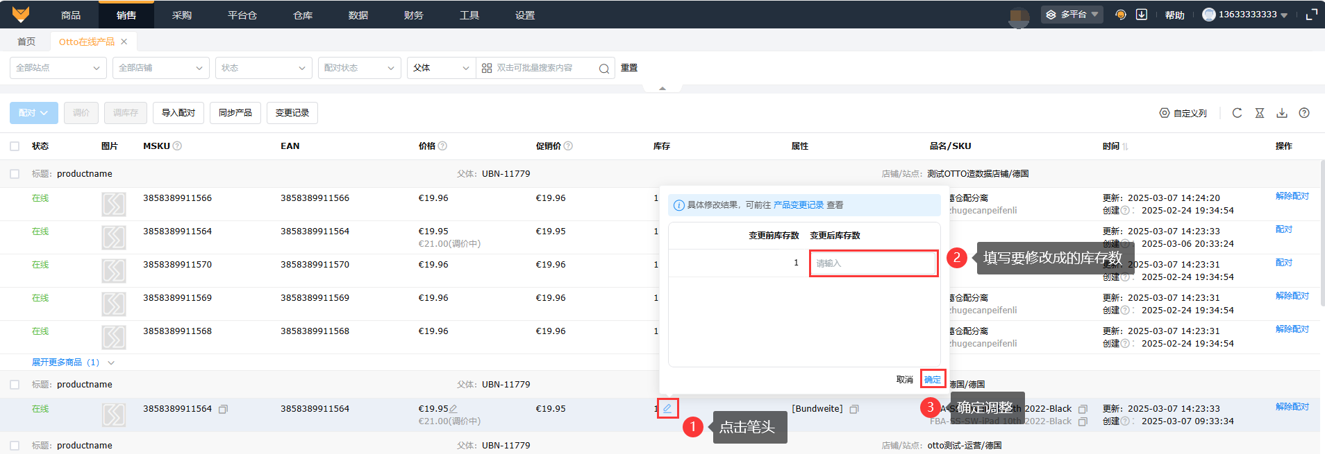 找到需要修改库存的产品,点击库存旁边的笔头,填写修改后的库存数,修改库存数填写的值必须大于0,确认保存调整。