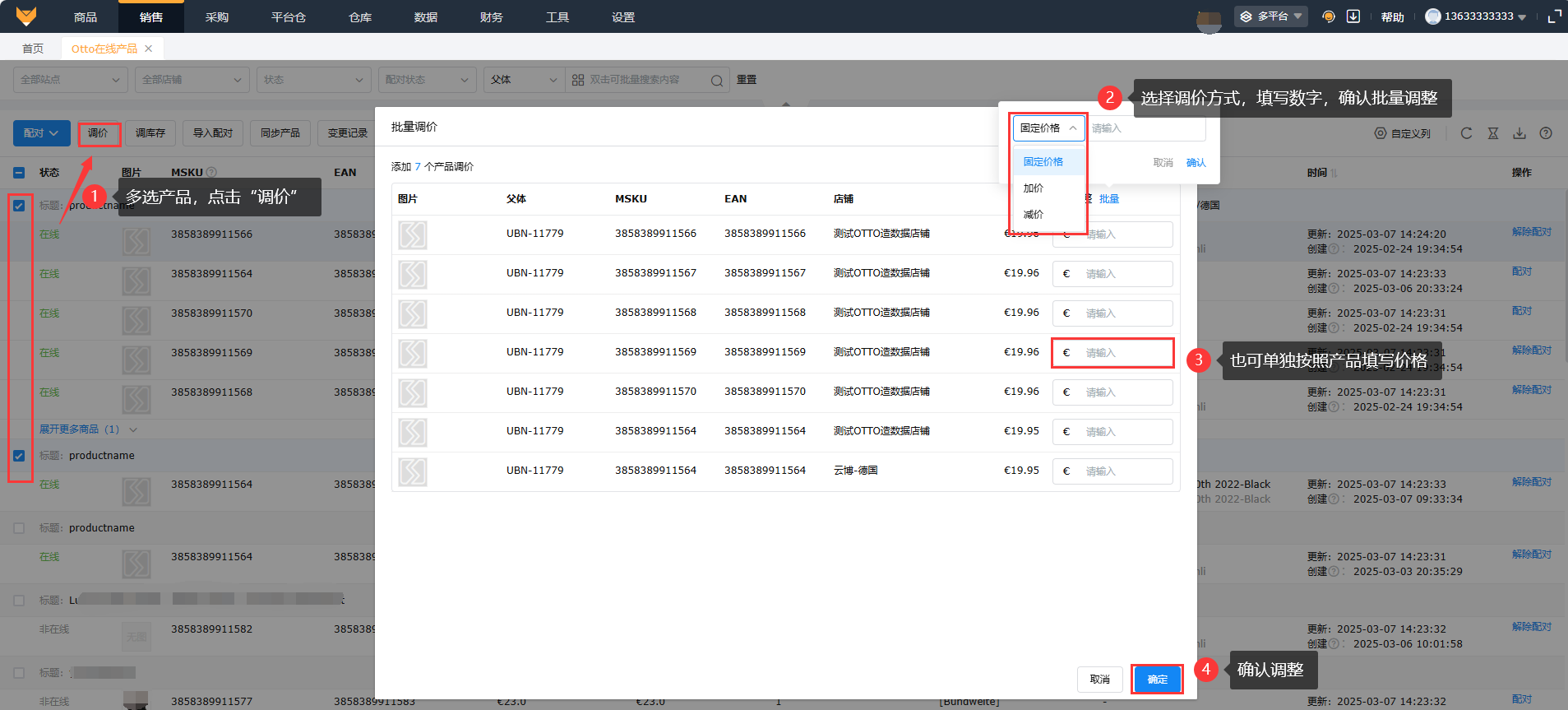 多选要修改的产品,点击“调价”,调价可以批量按照某个固定值直接调整,或者是在原来价格基础上加价或者减价多少