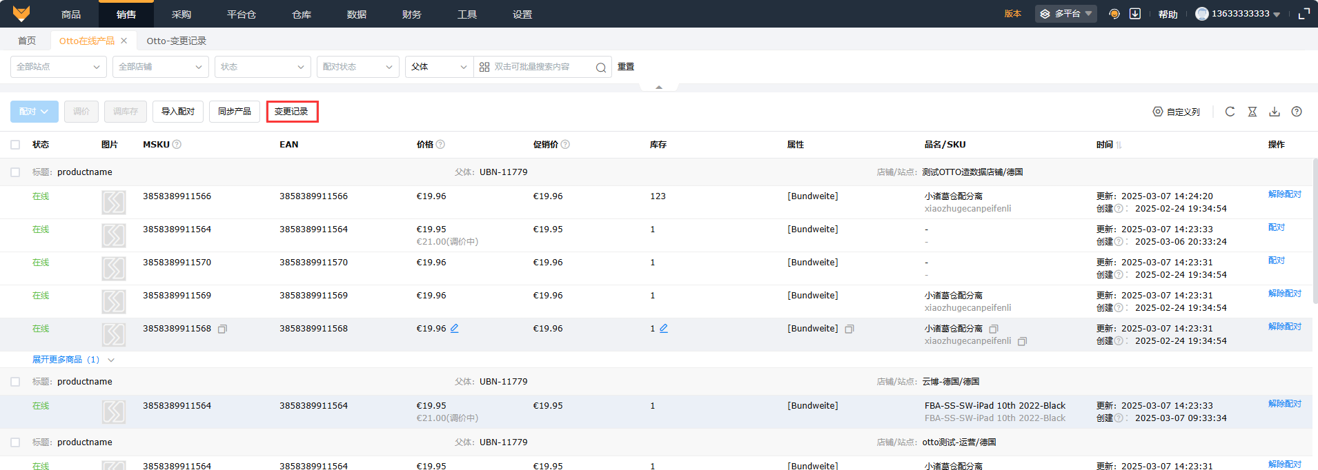 在系统完成授权Otto店铺后,支持在【销售】-【Otto在线产品】页面查看店铺在线、非在线状态产品,包括产品标题、MSKU、价格、促销价和库存等基本数据。