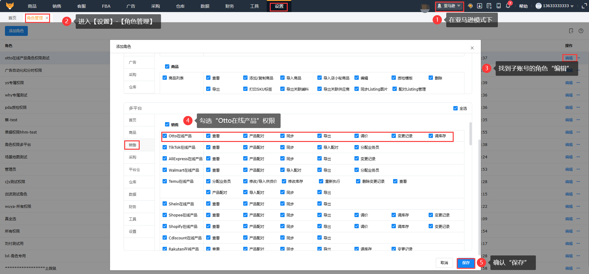 在亚马逊模式下,到【设置】-【角色管理】中找到子账号的角色,点击角色编辑,勾选上多平台-销售-Otto在线产品的权限,保存设置。