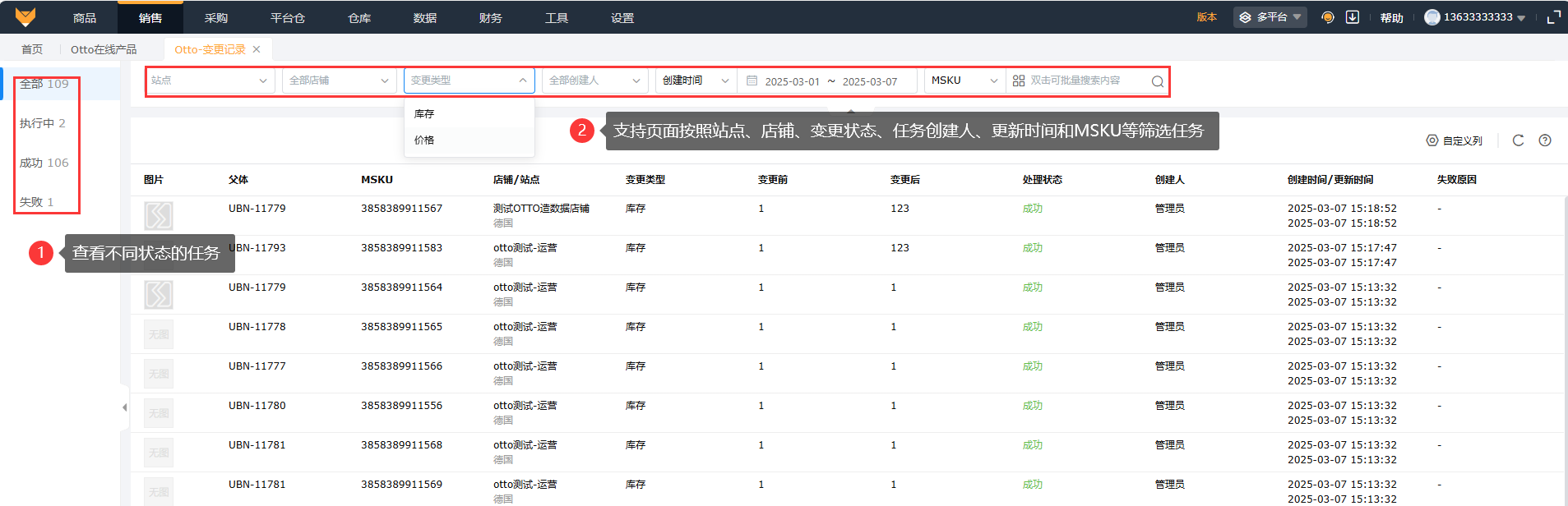 在变更记录中可以查看在系统操作修改产品的价格和库存的记录,可以查看执行中、执行成功和失败的任务状态,在页面支持按照站点、店铺、变更类型、创建人、任务创建时间和MSKU等条件筛选数据