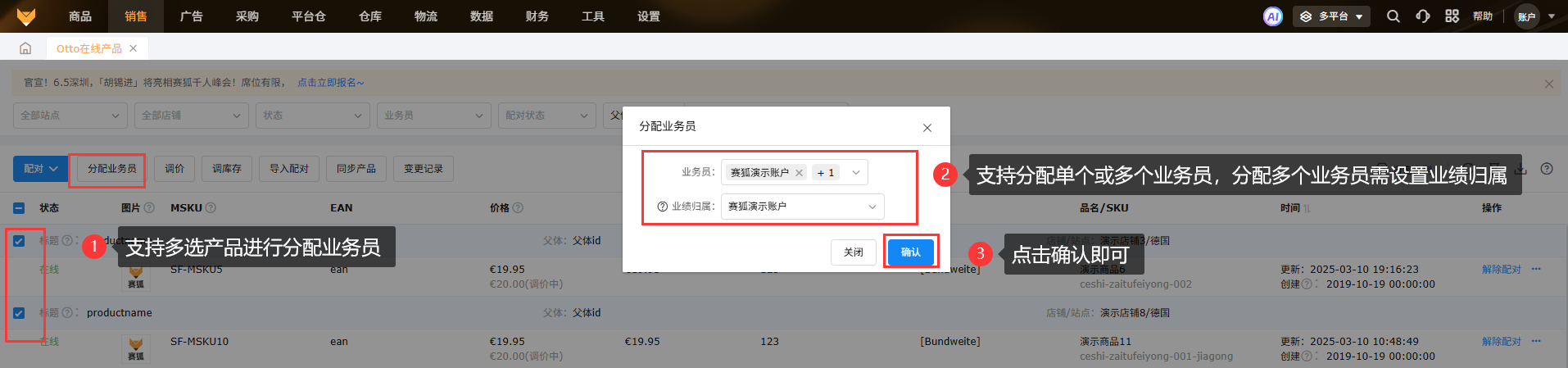 勾选产品,点击【分配业务员】;支持多选业务员,如果选择多个业务员,需选择业绩归属,如不选择则默认归属于第一个人;