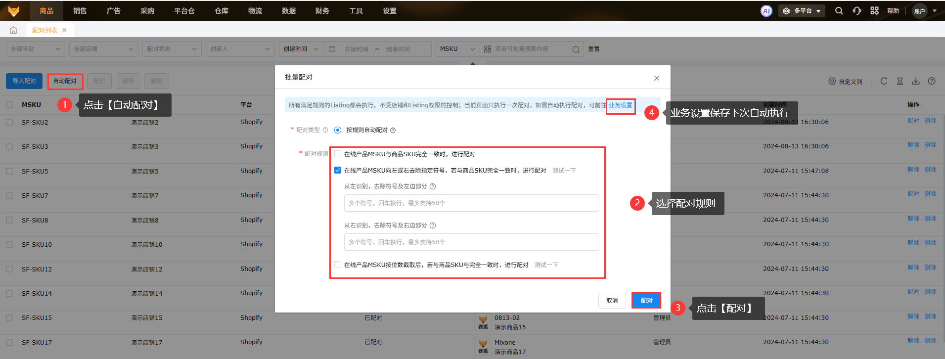 点击页面的自动配对,设置好具体的配对规则,点击配对后,系统可以根据设置的规则寻找符合条件的SKU,找到SKU后自动配对上产品;该页面的配对规则只执行本次操作,如果要保存这个自动配对规则,下次新增产品就自动配对上,可以点击“业务设置”跳转页面统一设置