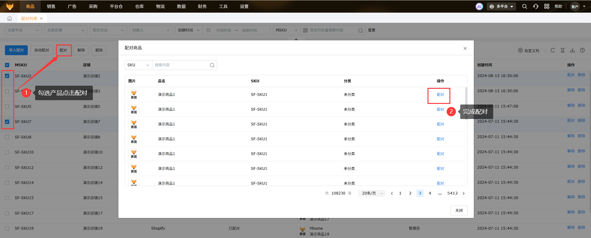 点击产品右侧的配对,选择要配对的本地SKU完成配对操作;如果多个产品要配对同一个本地SKU,也可以批量勾选产品,点击列表页面的配对完成操作