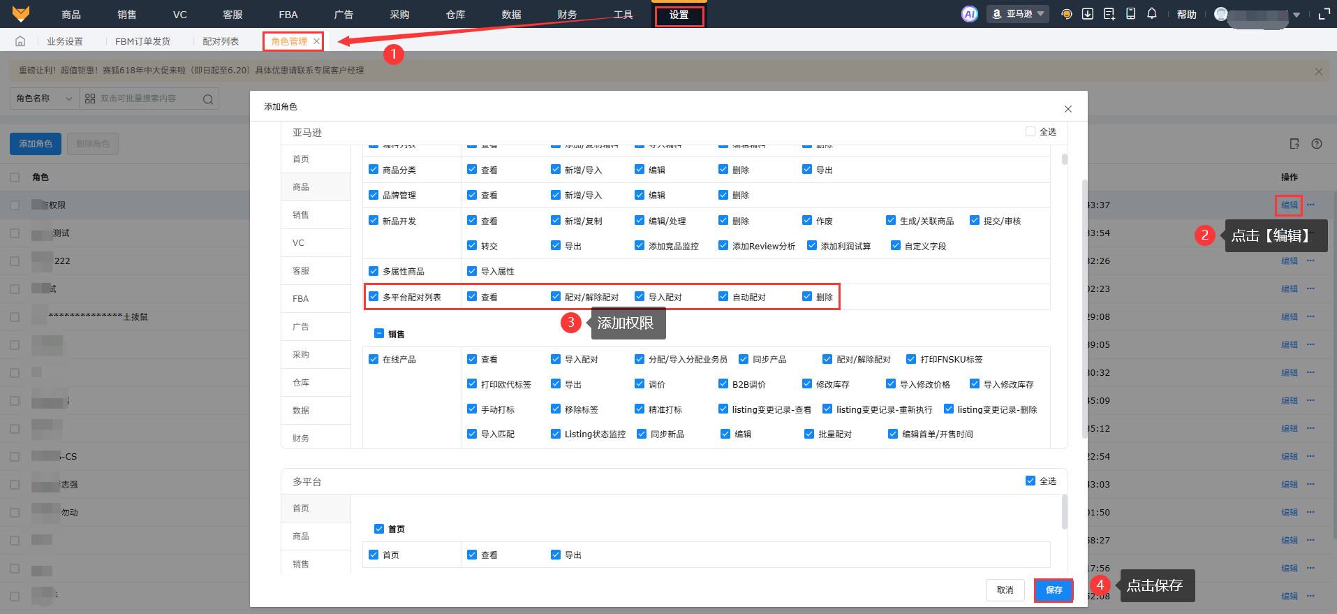 1.1 权限设置到【设置】-【角色管理】中找到对应子账号的角色,点击“编辑”勾选上“多平台配对列表”的权限,保存设置。