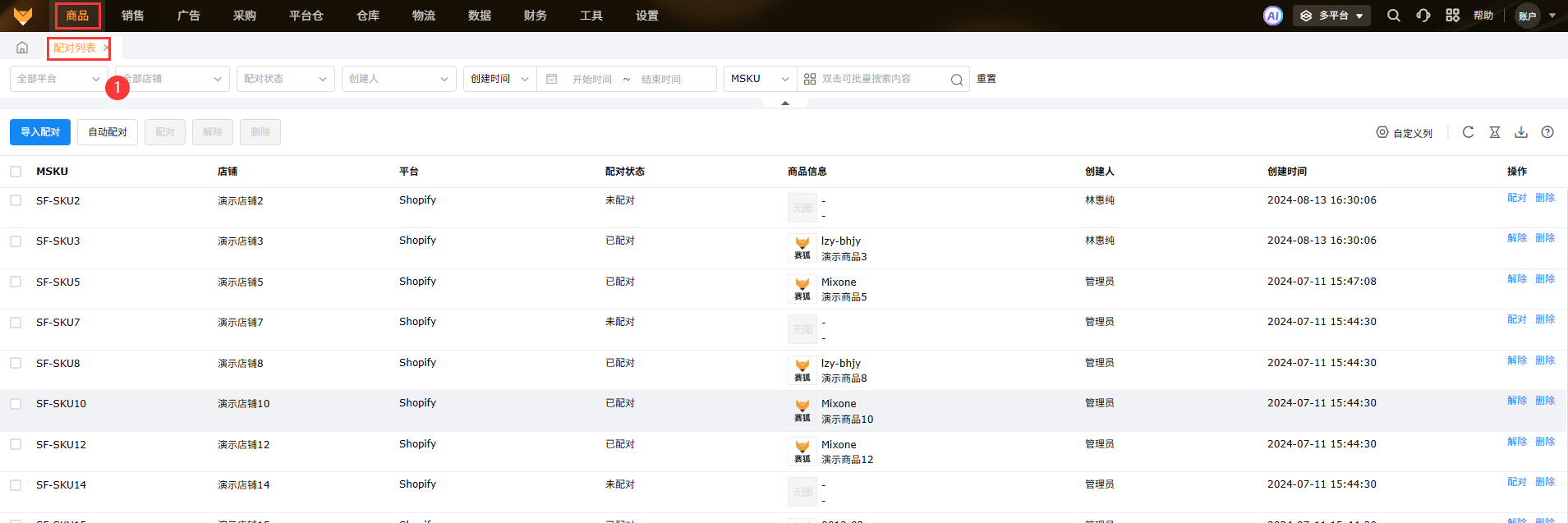 (2)多平台模式下的【商品】-【配对列表】