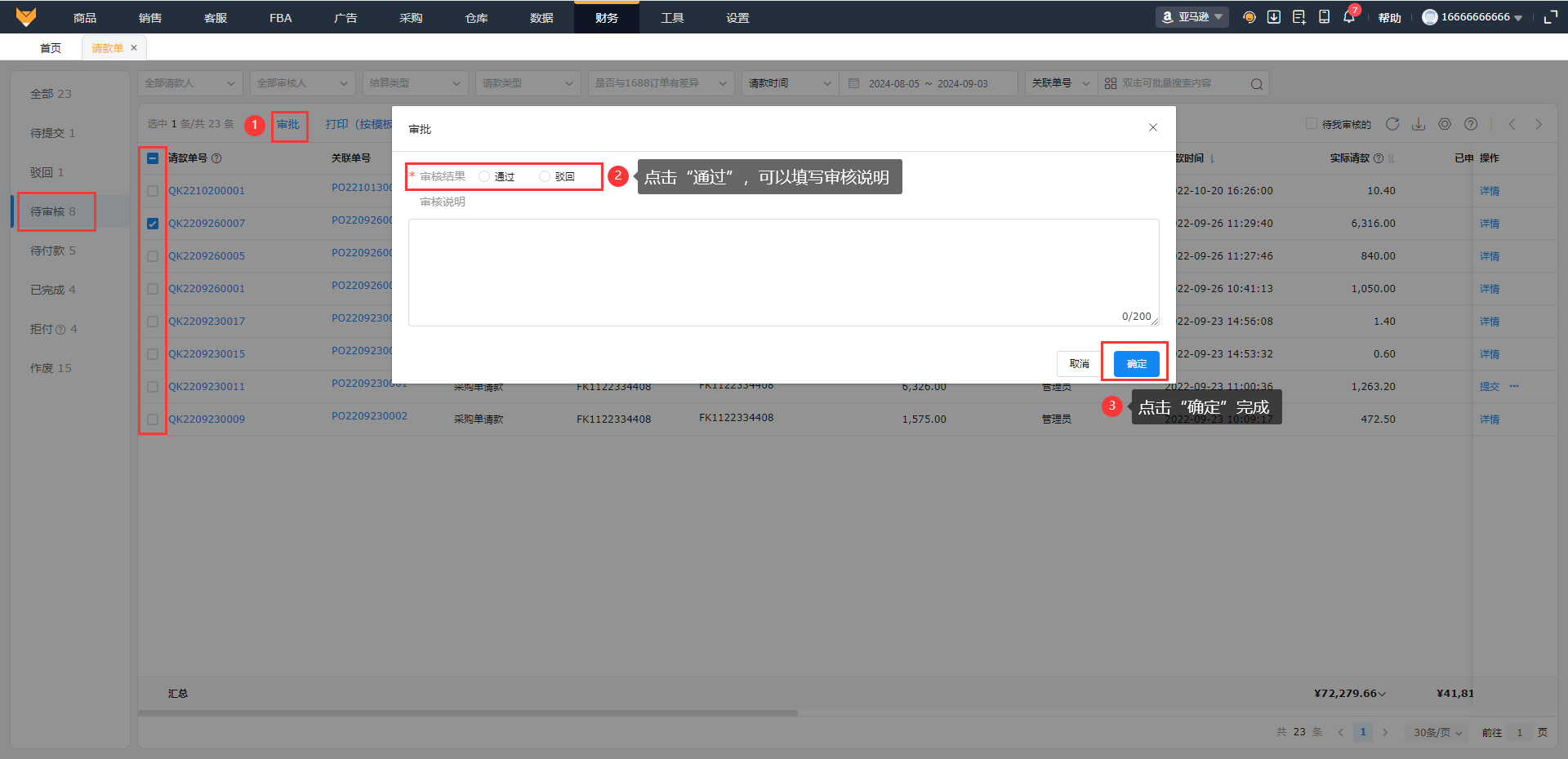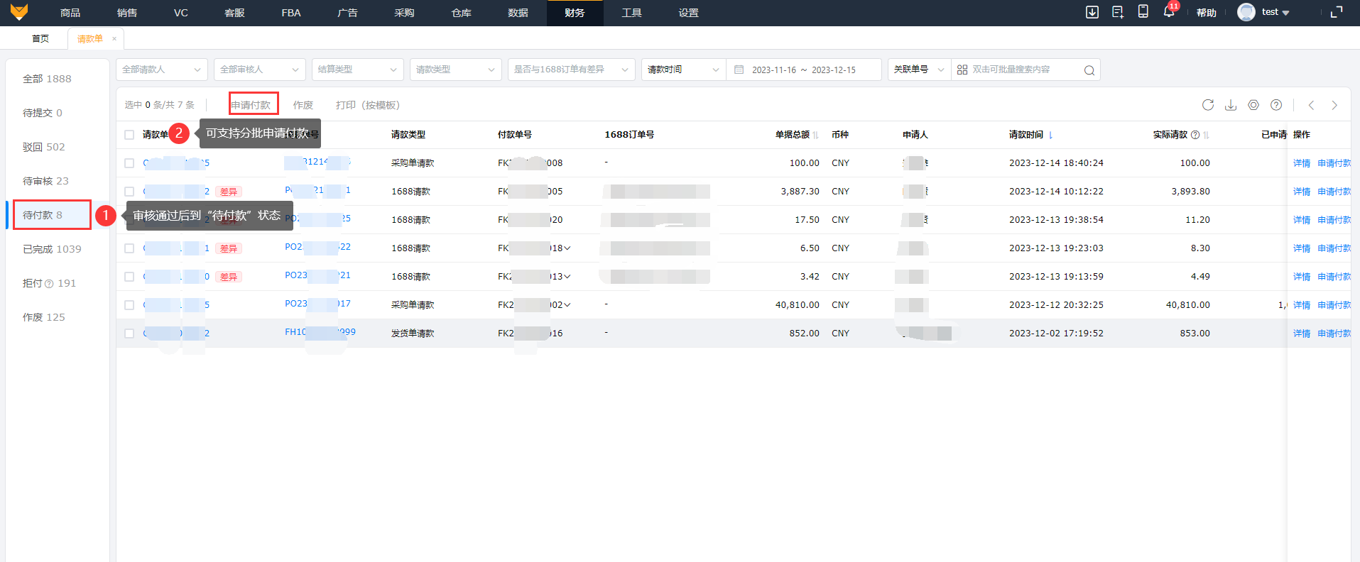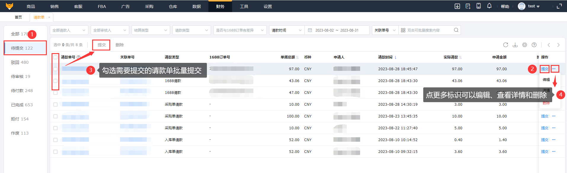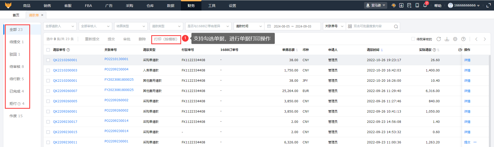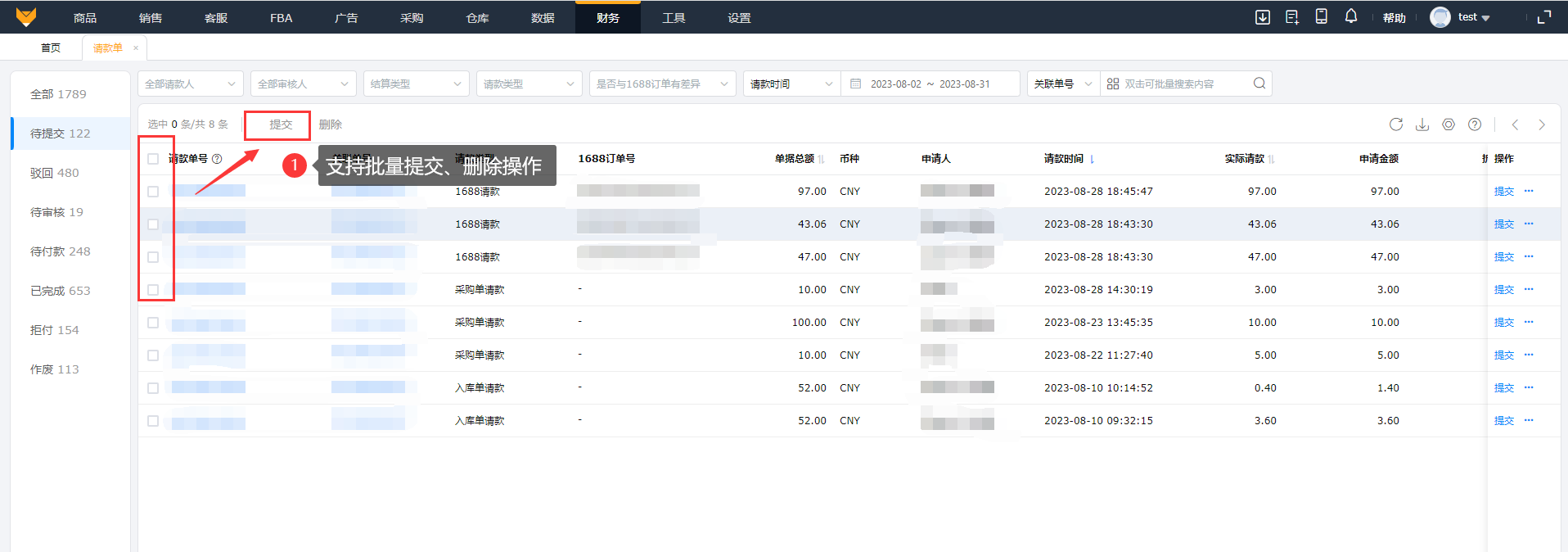 ②支持操作批量删除请款单和批量提交请款单。
