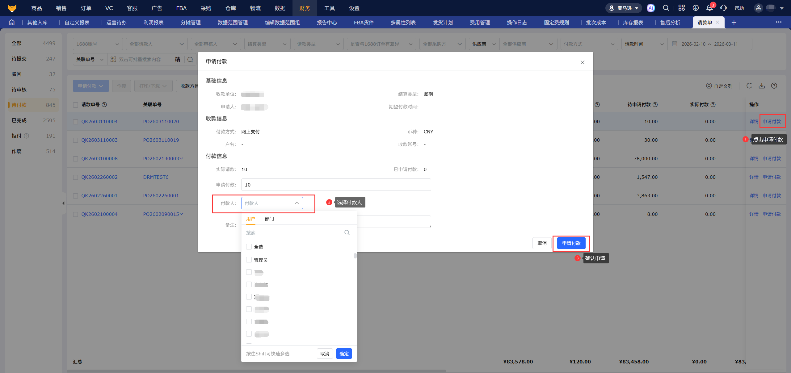 ③请款单申请付款支持选择付款人,付款人可以在付款单页面筛选“待我付款”查看本人需要付款的付款单