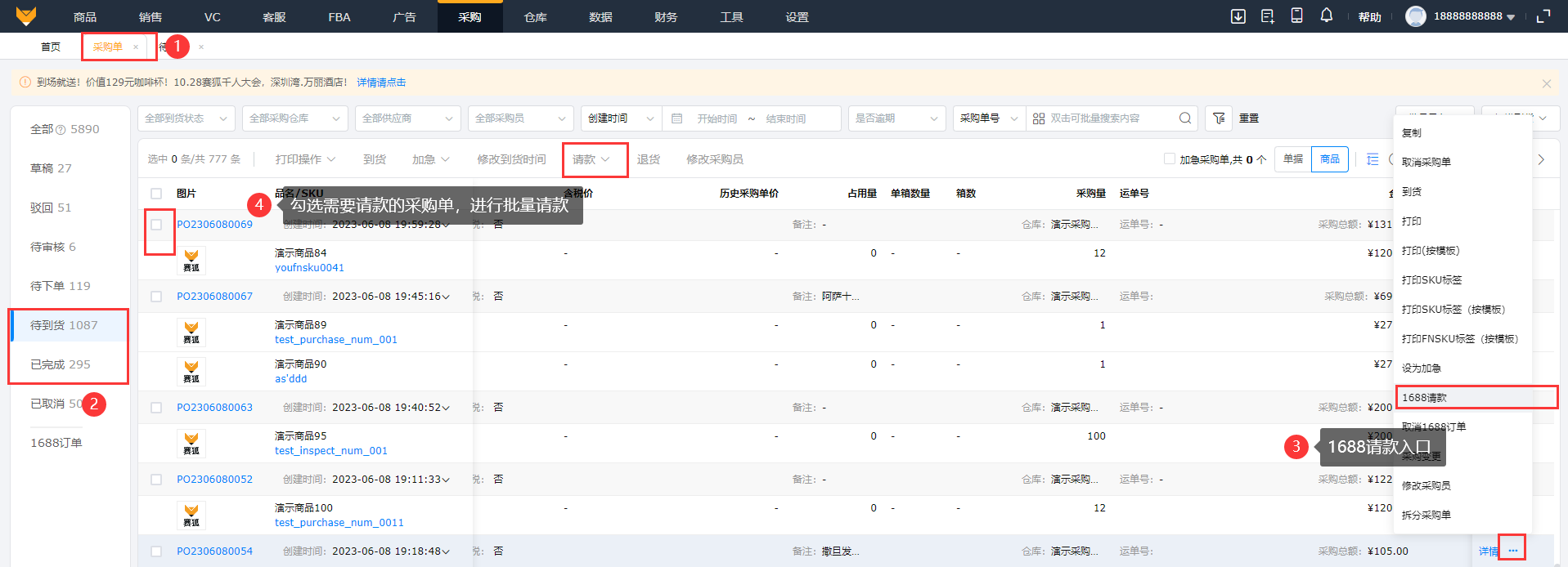 (1)入口:【采购】>【采购单】>【待到货】,只有1688订单状态为待到货或者已完成,请款状态为未请款时才有1688请款按钮。