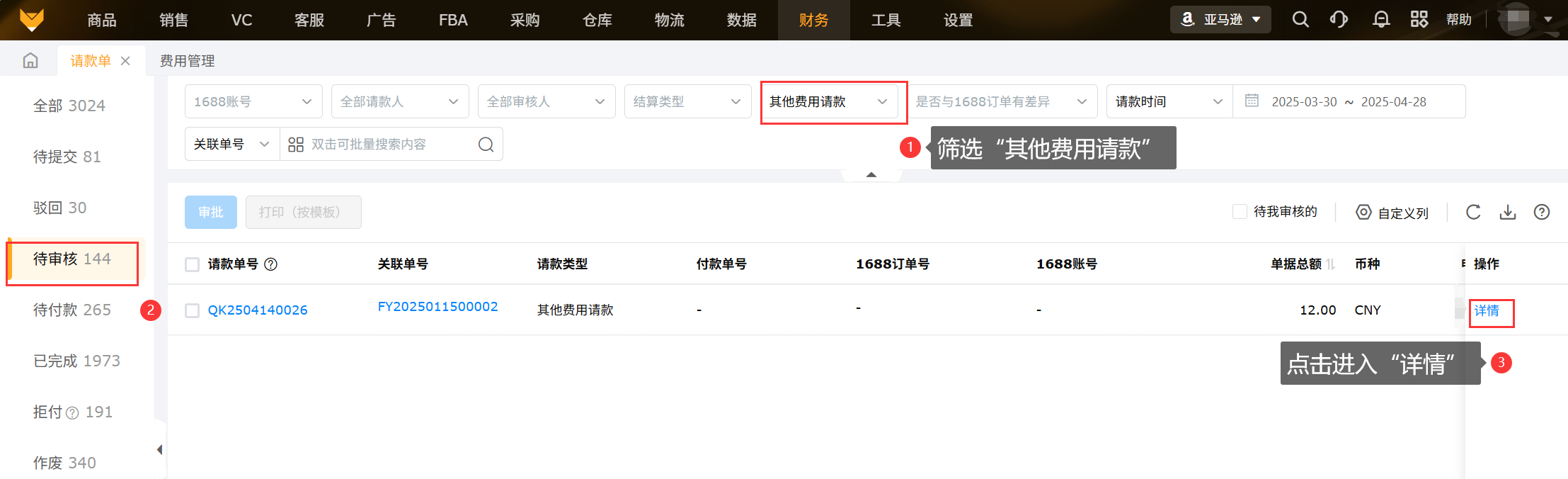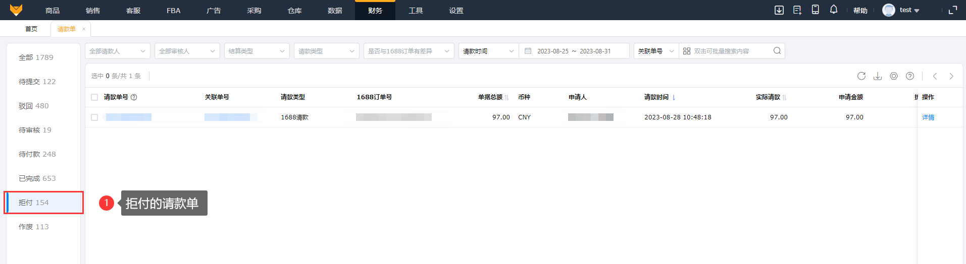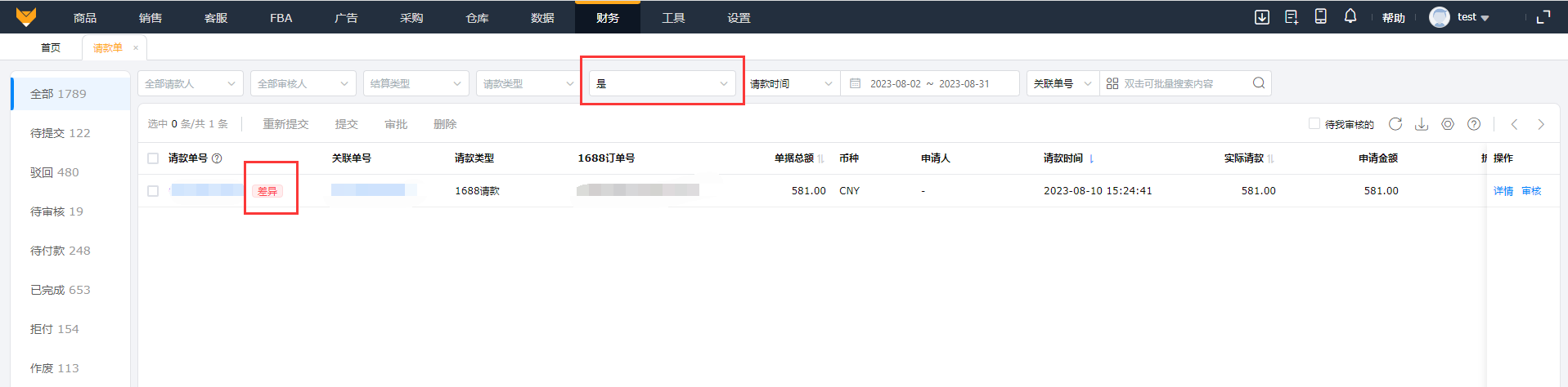 (3)请款成功后的1688采购请款单会在【财务】>【请款单】>【待提交】中汇总,采购员可以在请款单查看请款进度;当1688订单跟请款单金额有差异时,请款单号后会有“差异”标识。