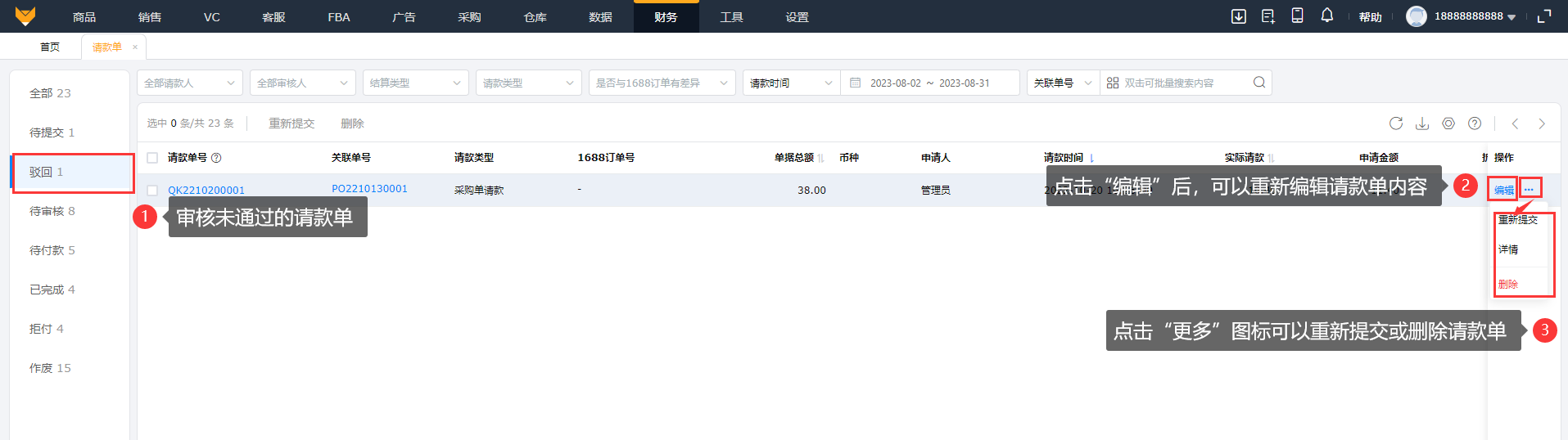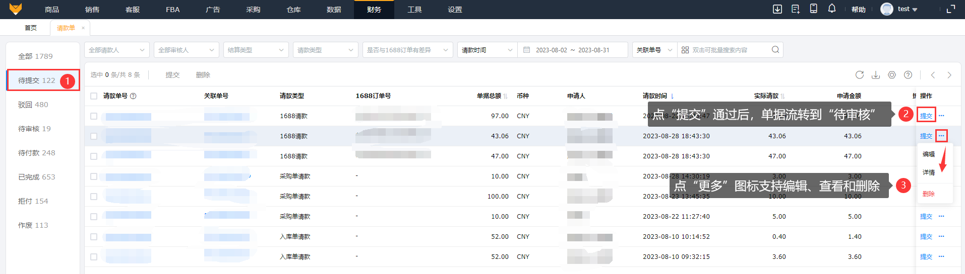 ①在采购模块的待到货进行1688请款,成功后的请款单会在请款单待提交汇总。点击“更多”按钮,可以对请款单进行编辑和删除;