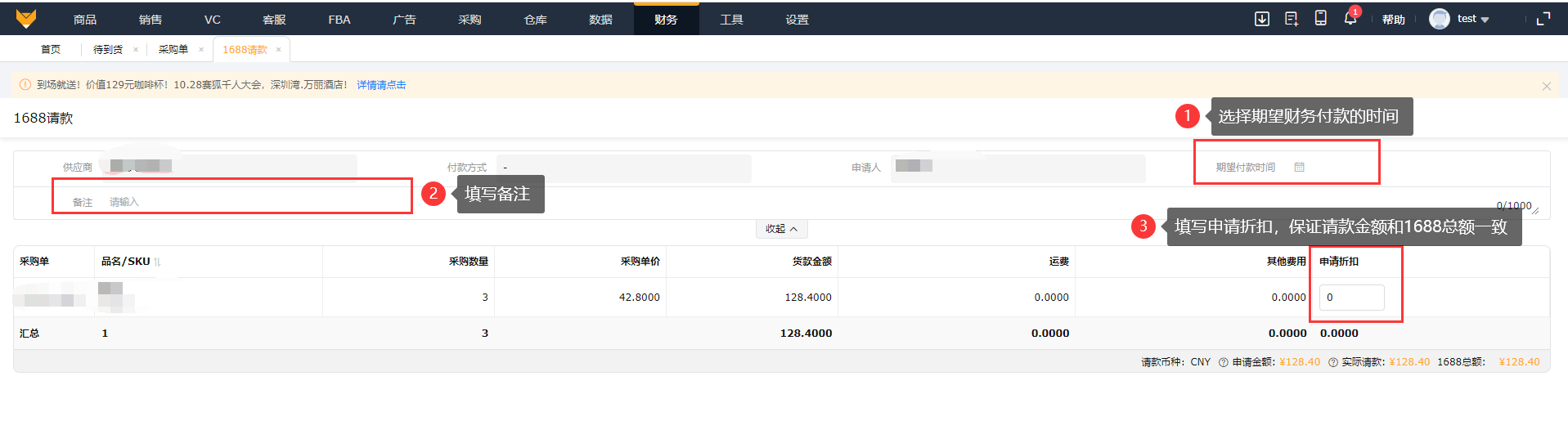 ③当实际金额跟1688应付金额不一致,无法请款,请先变更采购单。