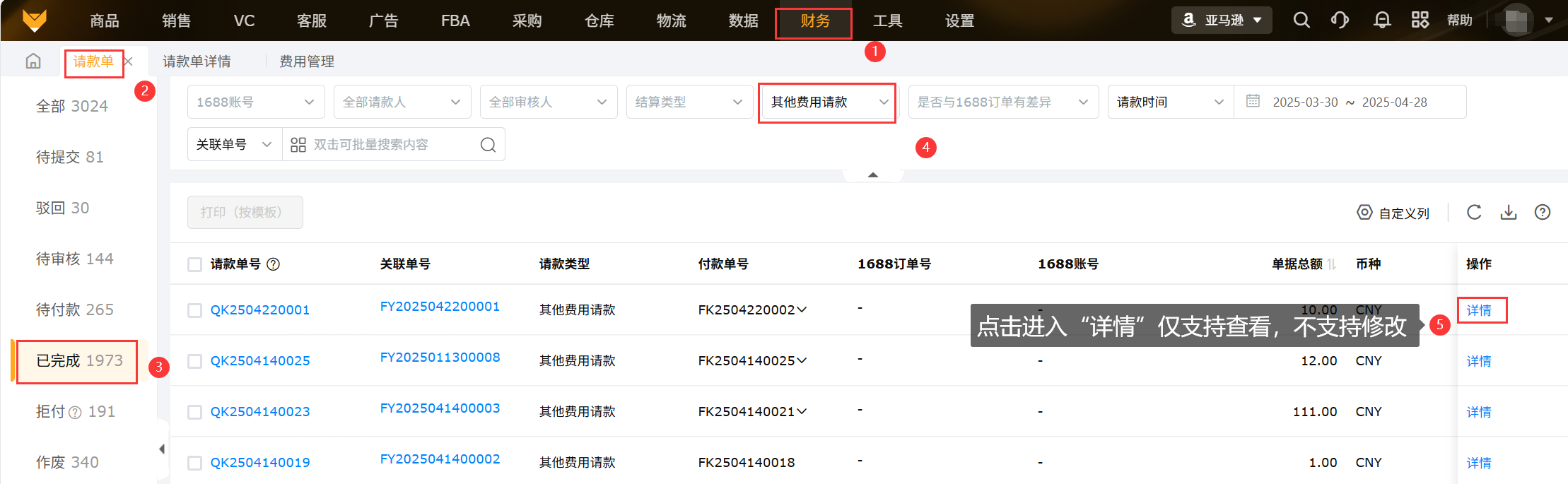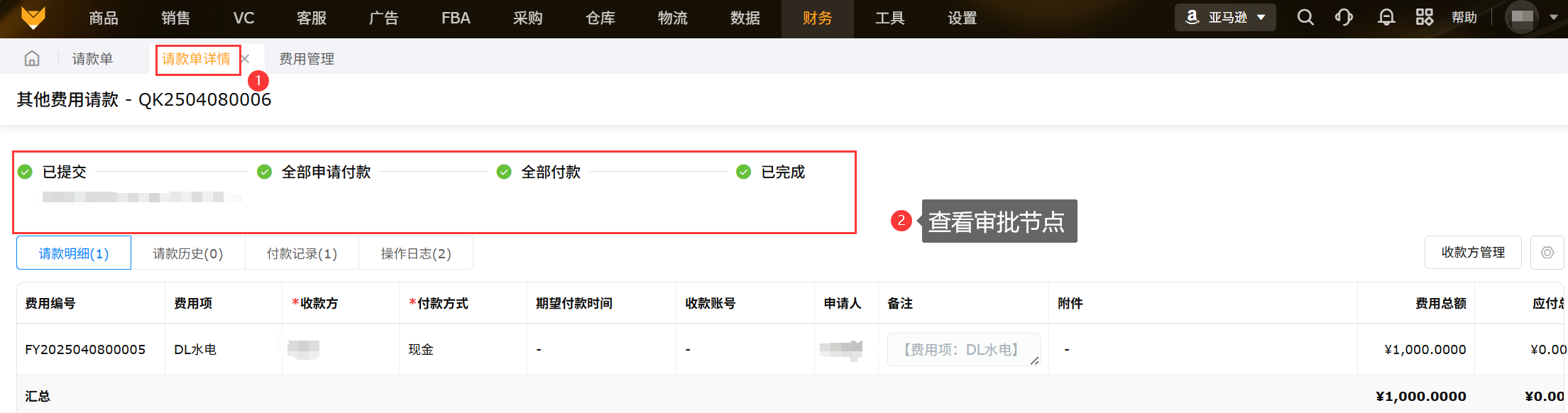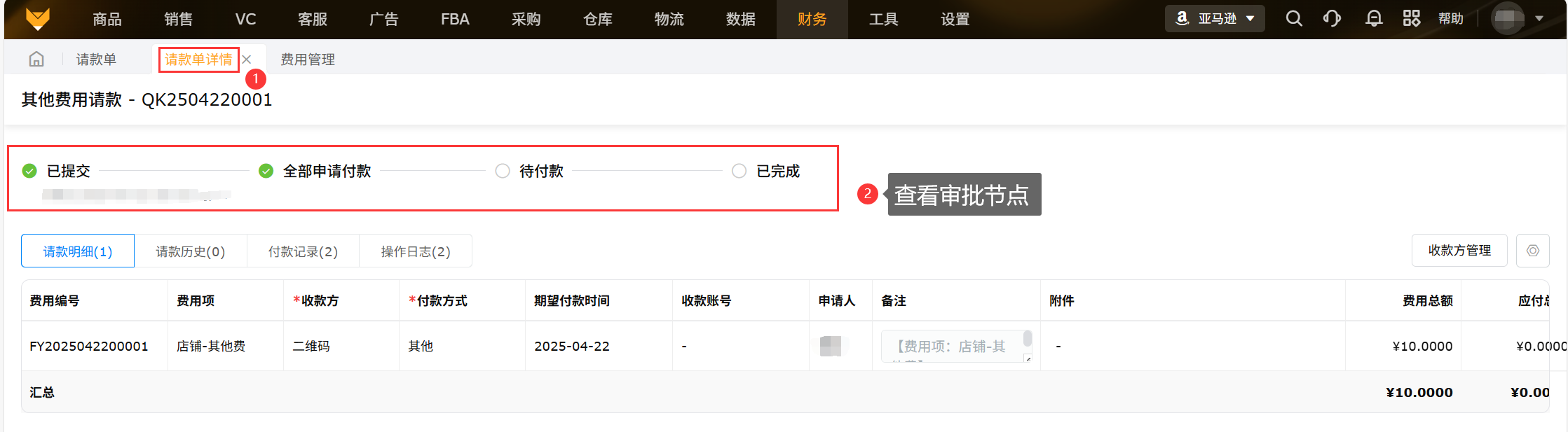 ②可以查看请款单的基本信息和请款信息,等待付款;