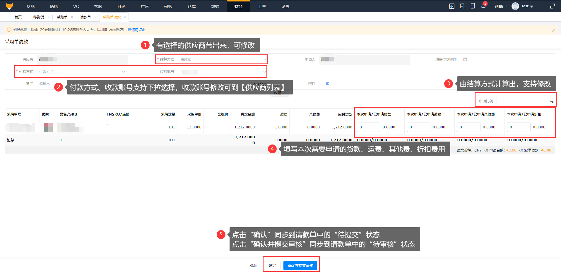 (2)点击“请款”,填写请款单,支持修改申请比例、付款方式,填写本次申请货款、运费、其他费,以及需要申请的折扣;