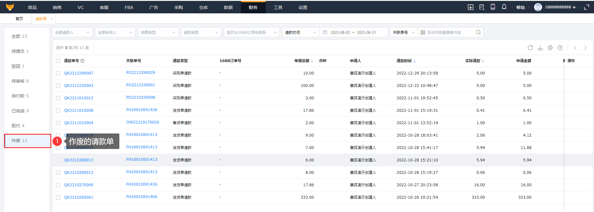 查看作废的请款单。