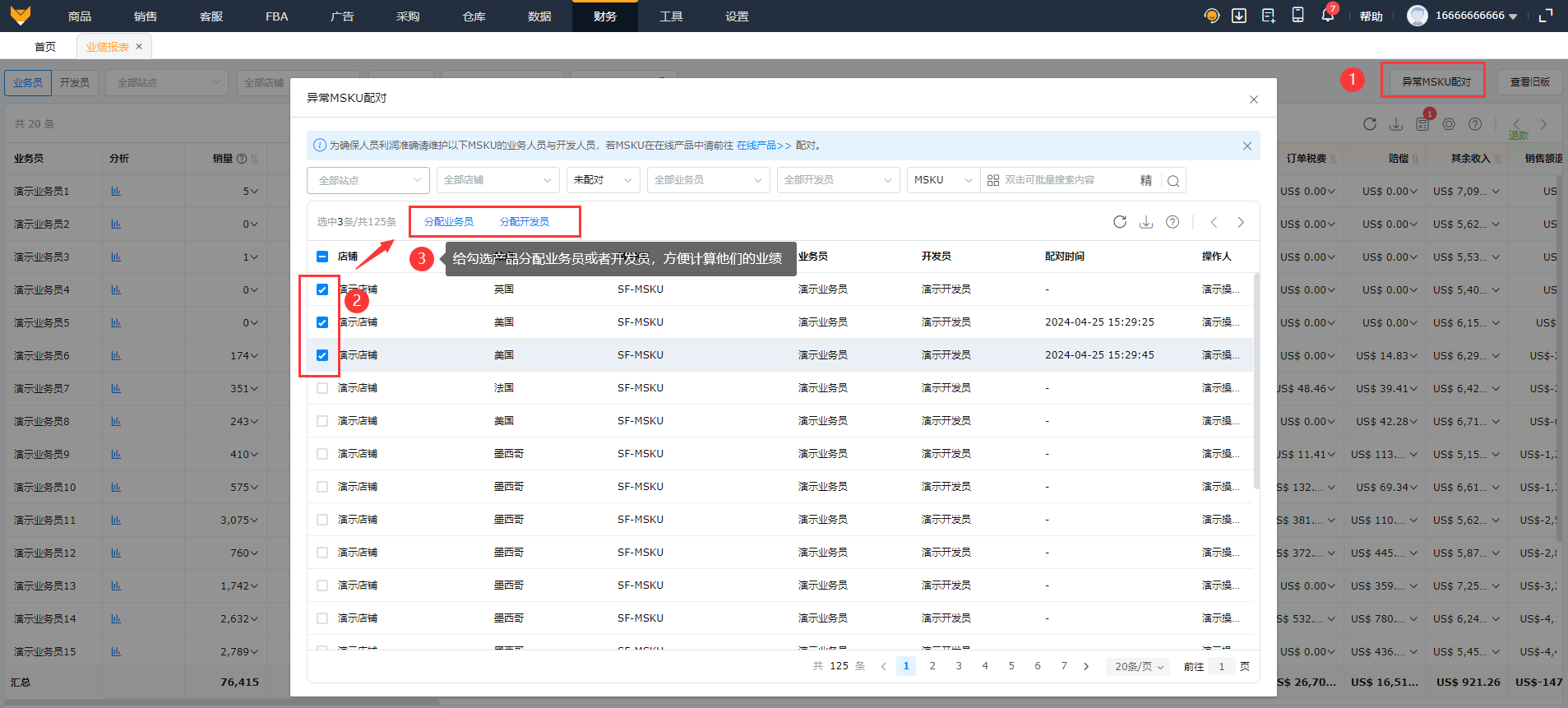 针对在【利润报表】存在该MSKU,但是在【销售】-【在线产品】里没有MSKU,可以在通过异常MSKU配对来分配业务员或者开发员。