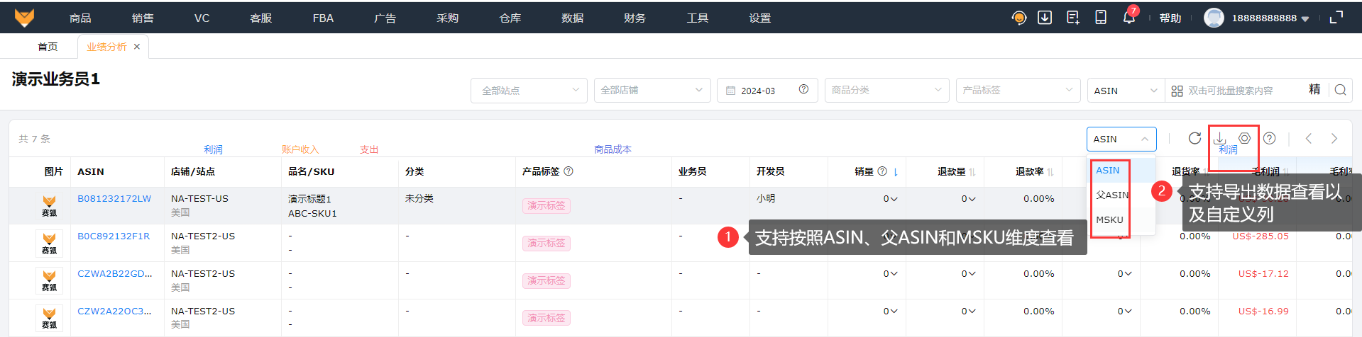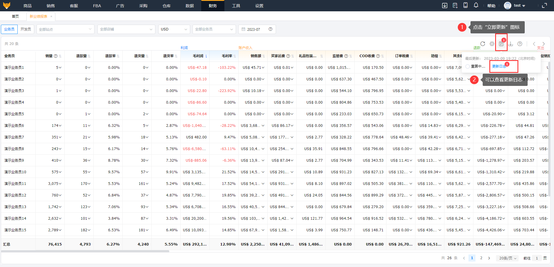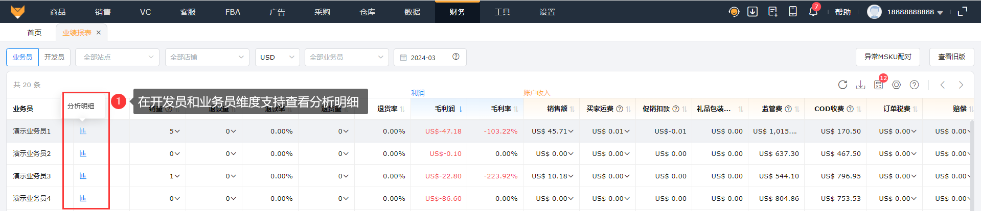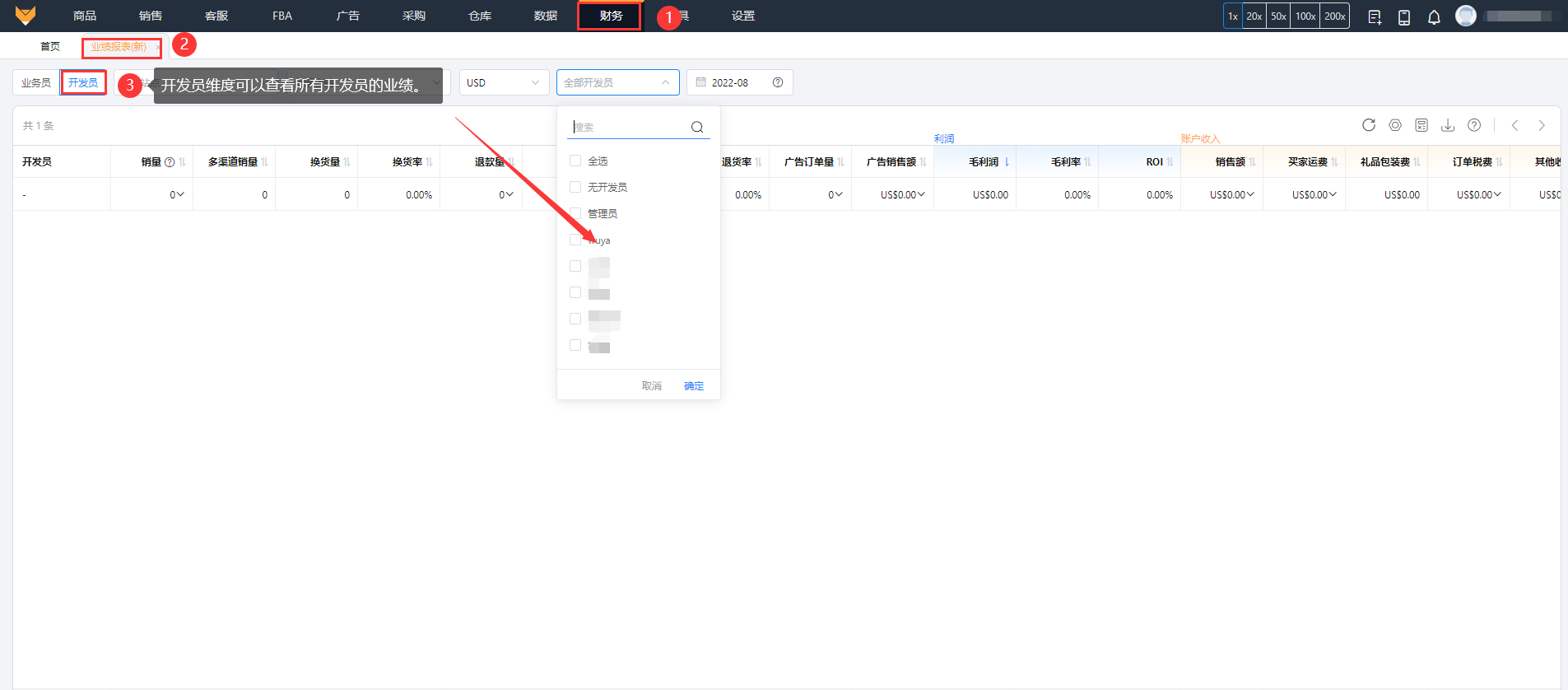 财务可以从业务员、开发员的维度查看店铺的利润、账户收入、退款、支出、商品成本、自定义费用,方便直接计算提成。