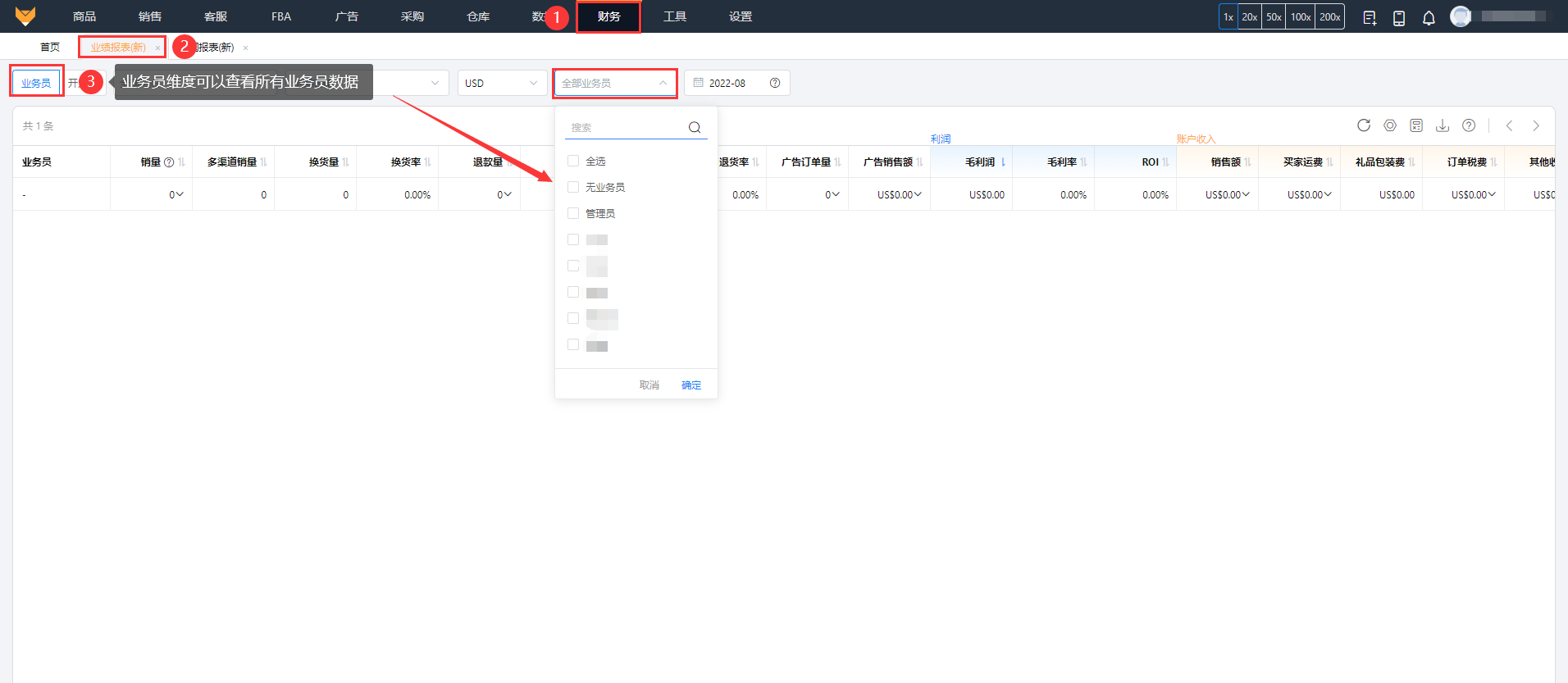 业务员维度可以查看所有业务员的业绩。