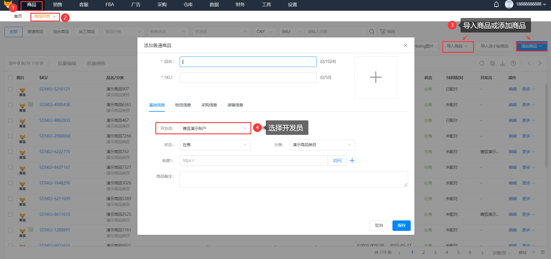 1.1设置开发员:在【商品】>【商品列表】,添加商品时进行录入;
