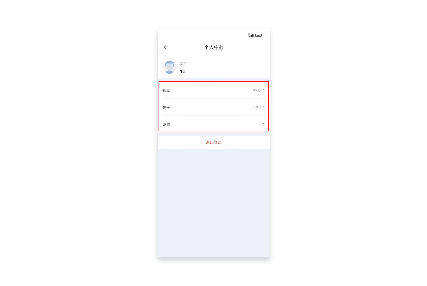 (2)在个人中心页可以查看账号和手机号,以及选择仓库、关于、设置和退出登录。