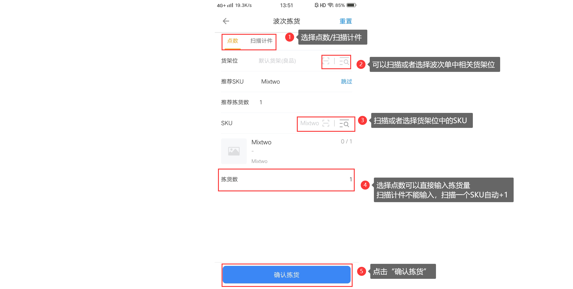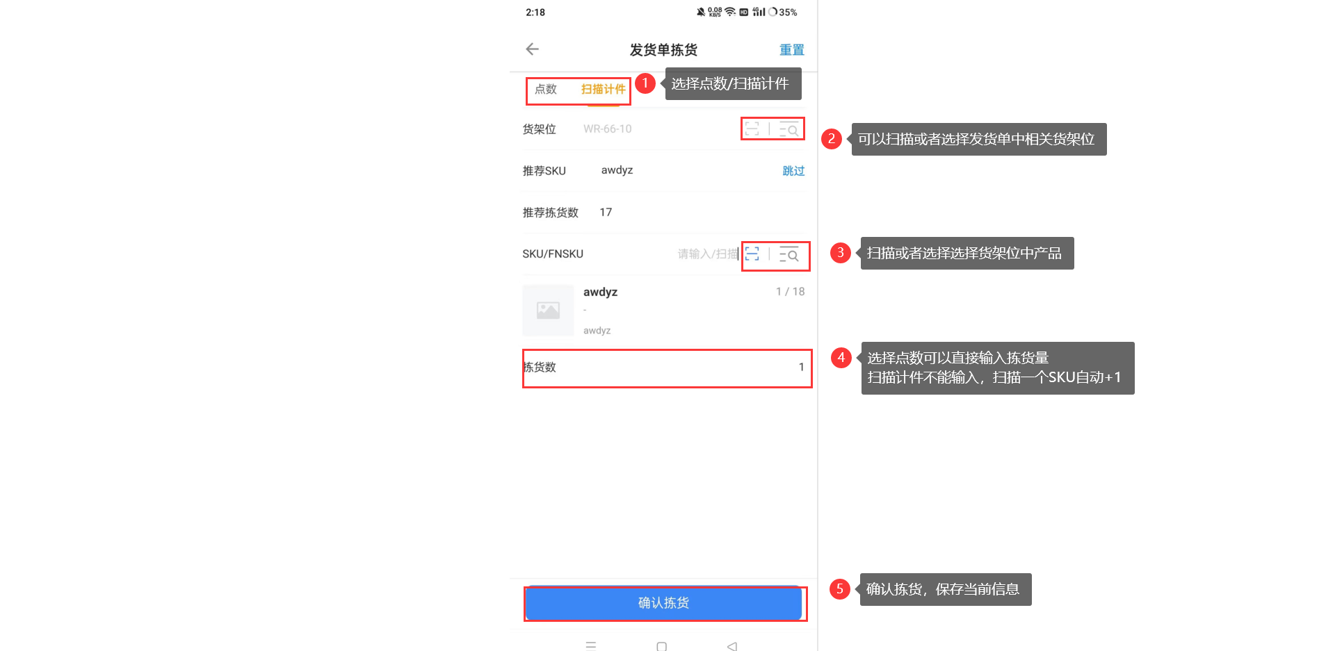 3.1、填写拣货信息进入发货单/波次拣货详情页面,可以选择点数或者是扫描计件两种方式来拣货,区别:点数可以直接输入拣货SKU的拣货数,扫描计件不支持填写拣货数,确认拣货后拣货数量默认加一