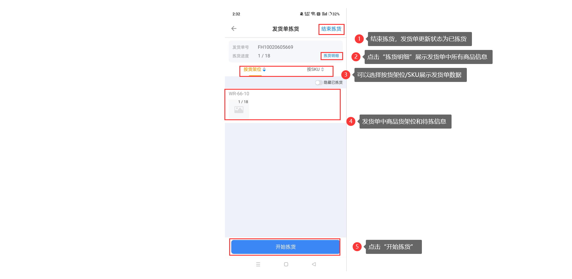 点击【开始拣货】进入发货单/波次单详情页面,列表会展示单据中所有的包裹的产品信息,以及已拣货/总数量,数据展示支持按照货架位或者SKU维度展示发货单/波次中数据,可以根据货架位和商品信息拣货出库;点击“开始拣货”进入拣货详情页,操作商品拣货出库;点击“结束拣货”分拣中的发货单/波次单会保存当前拣货信息,并更新发货单/波次单拣货状态为“已拣货”,后续这个发货单/波次单不支持继续操作拣货发货单页面: