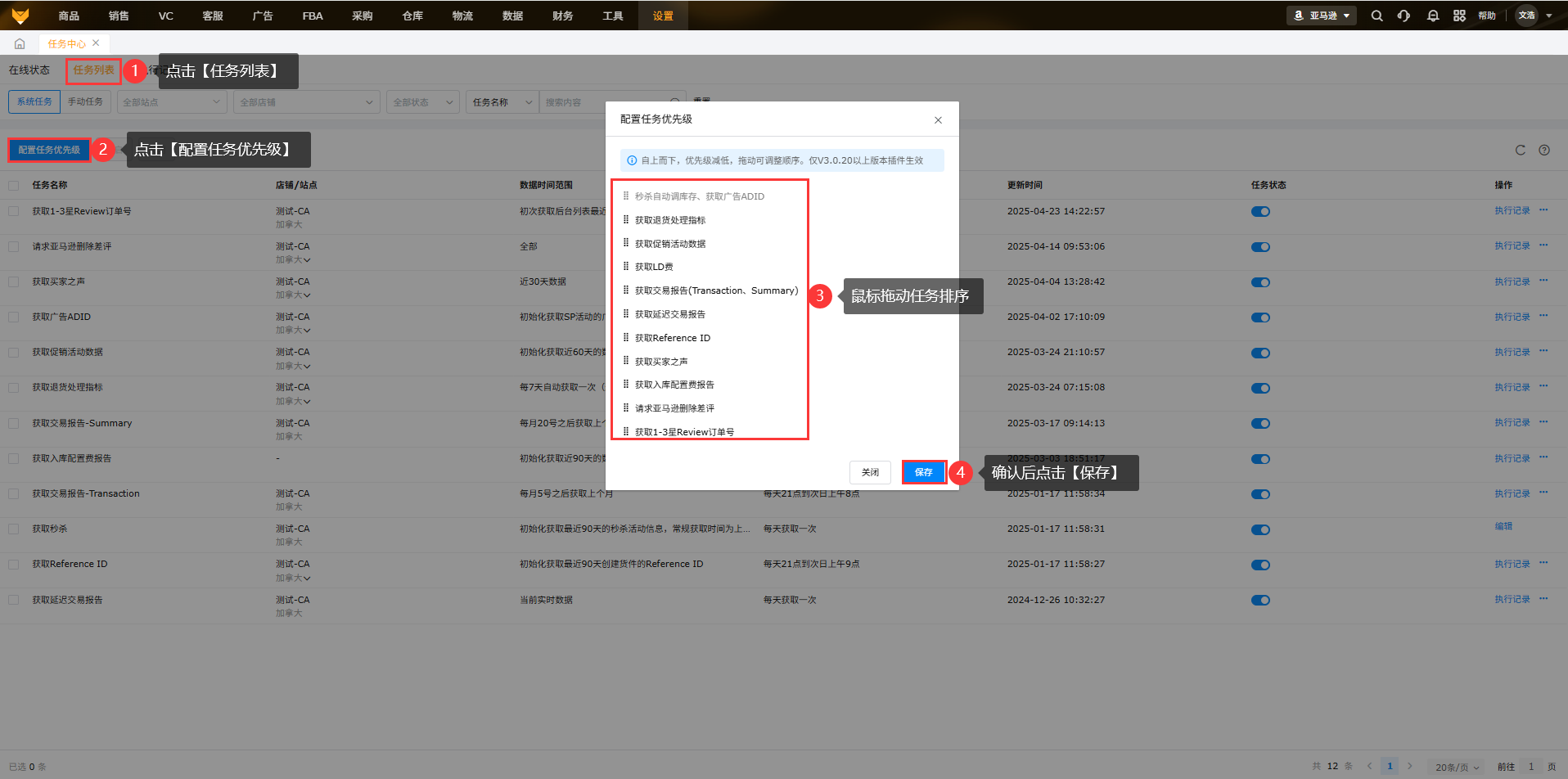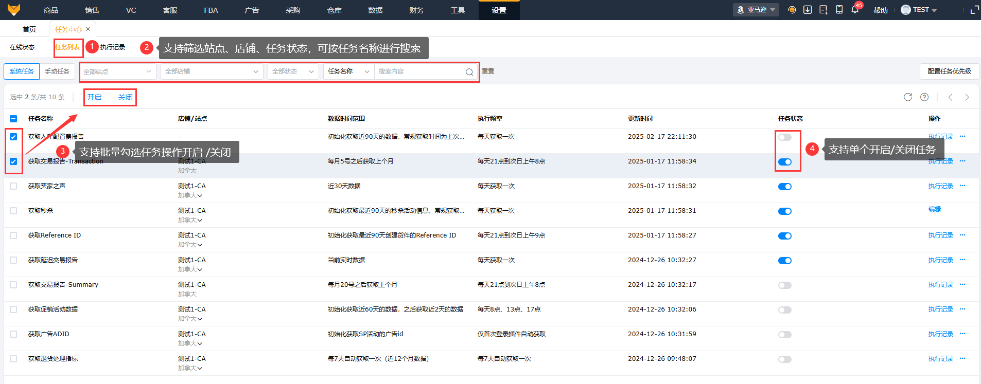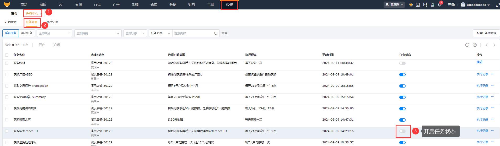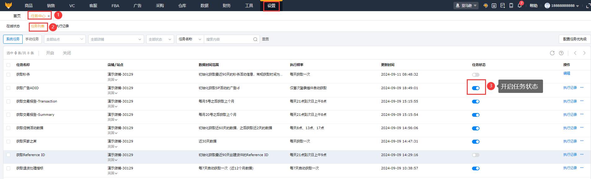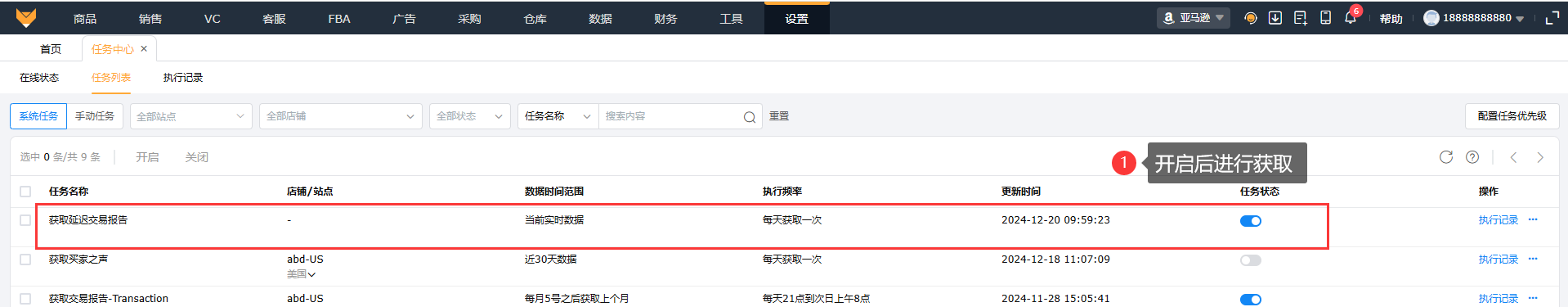 要保持亚马逊店铺后台与插件同时在线,并且在【设置】-【任务中心】-【任务列表】开启数据获取配置开关。