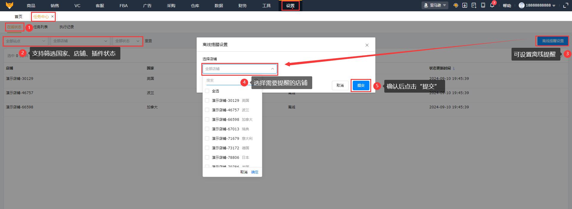 关键查看不同店铺插件在线情况,方便快速发现异常,支持设置离线提醒(【业务设置】-【消息】,运营通知开启“插件离线提醒”)