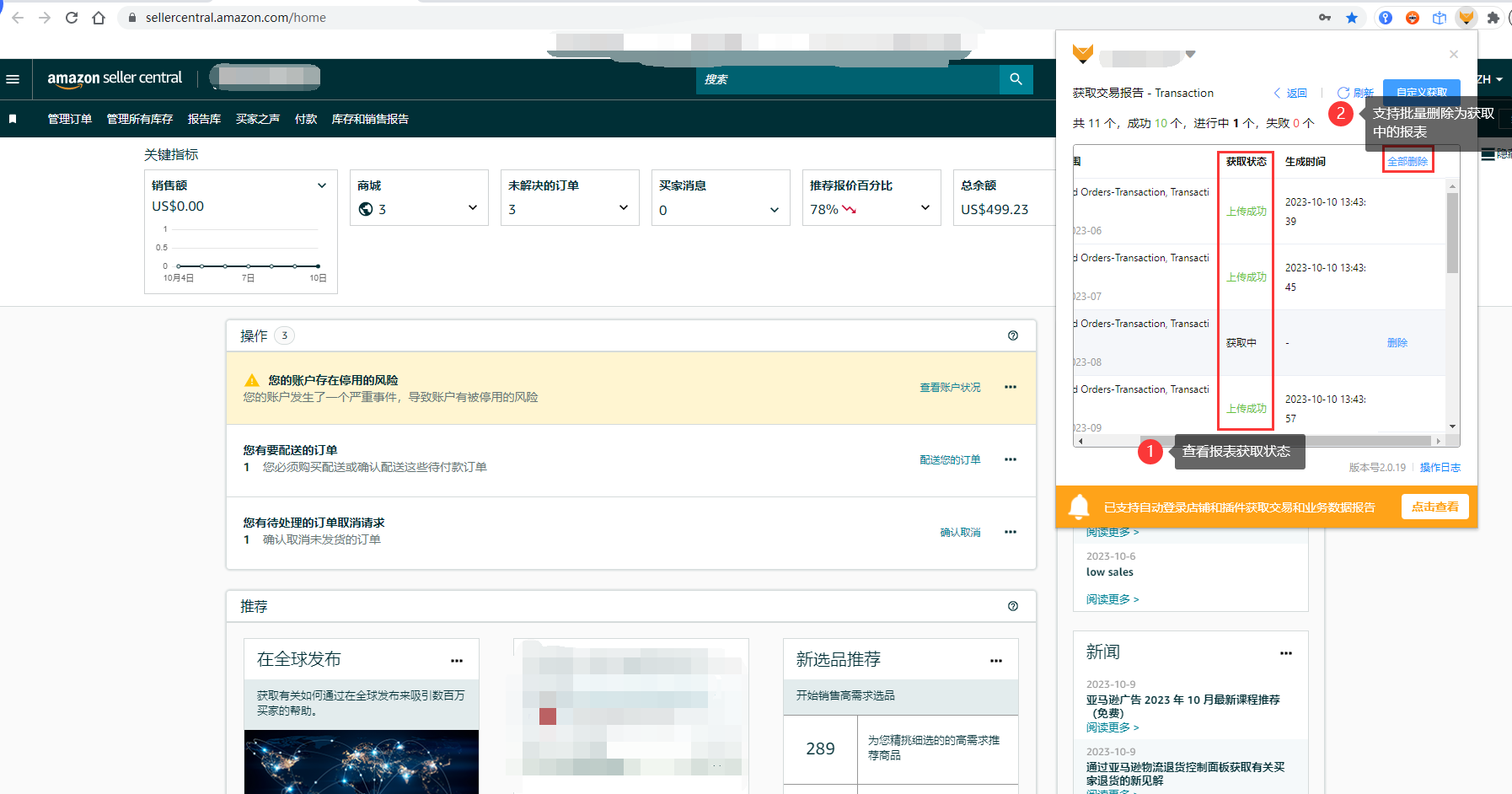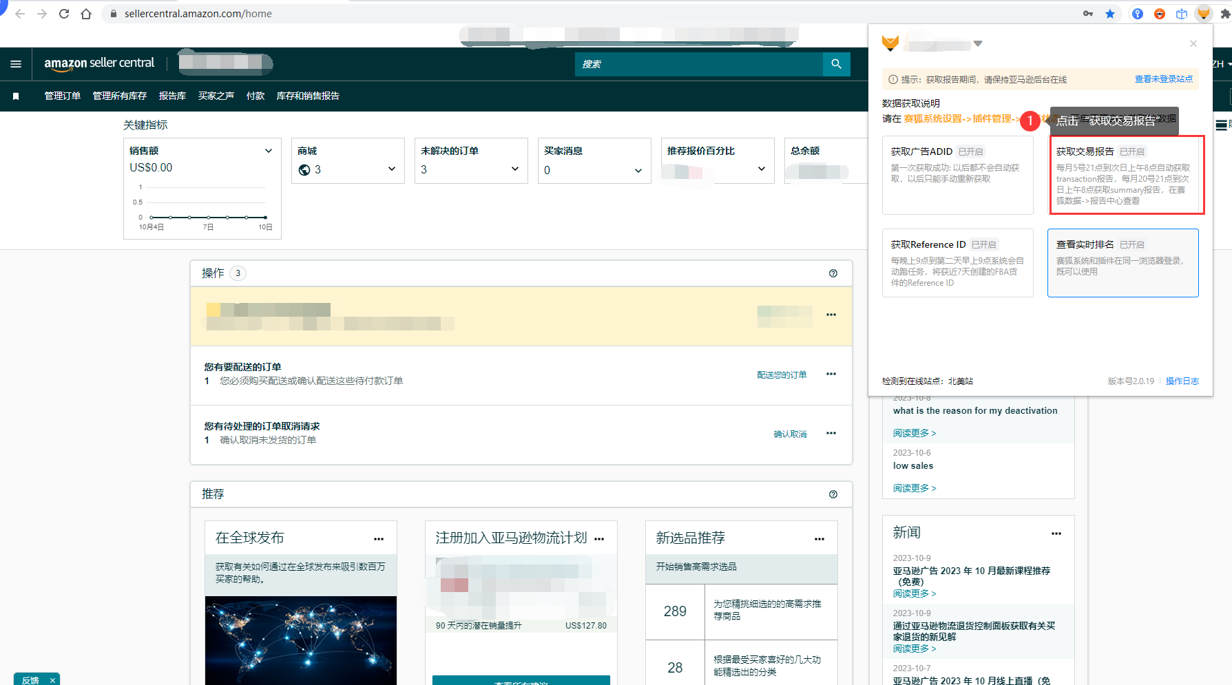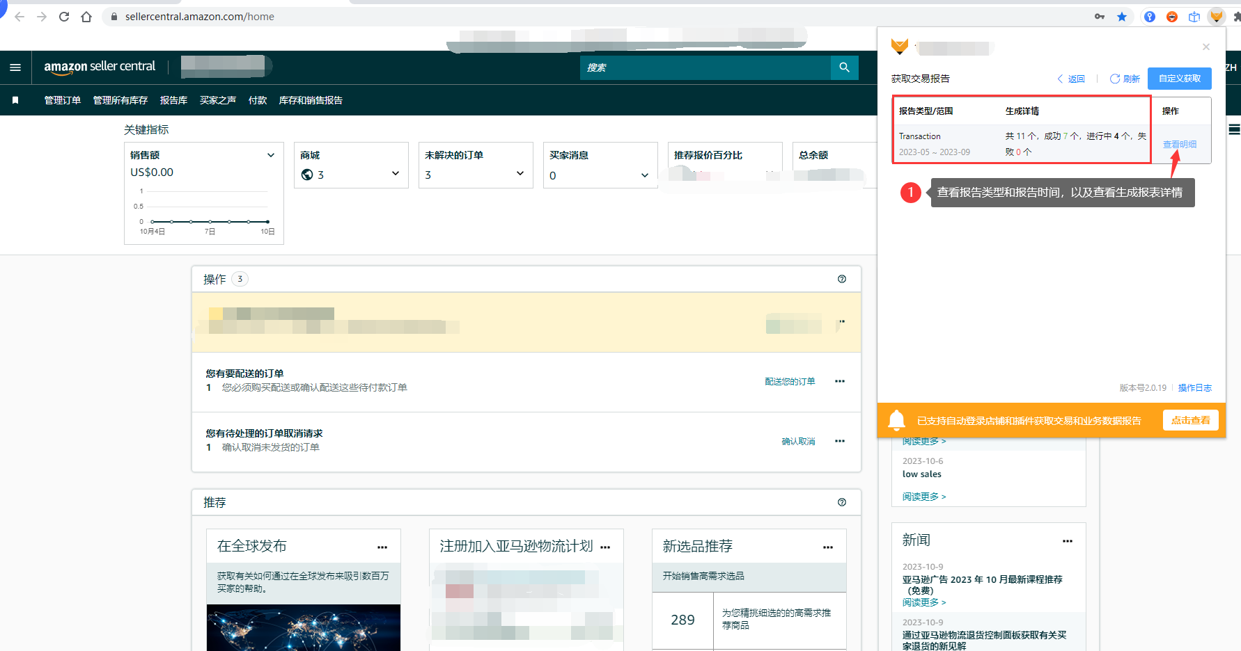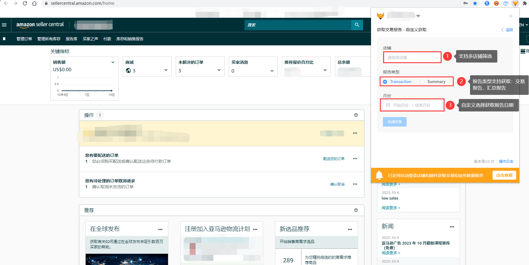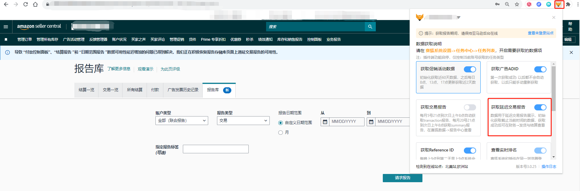 插件安装成功后,在浏览器上登录亚马逊账号和赛狐账号密码,系统将会自动获取上个月交易报告,汇总报告是每月20号插件获取: