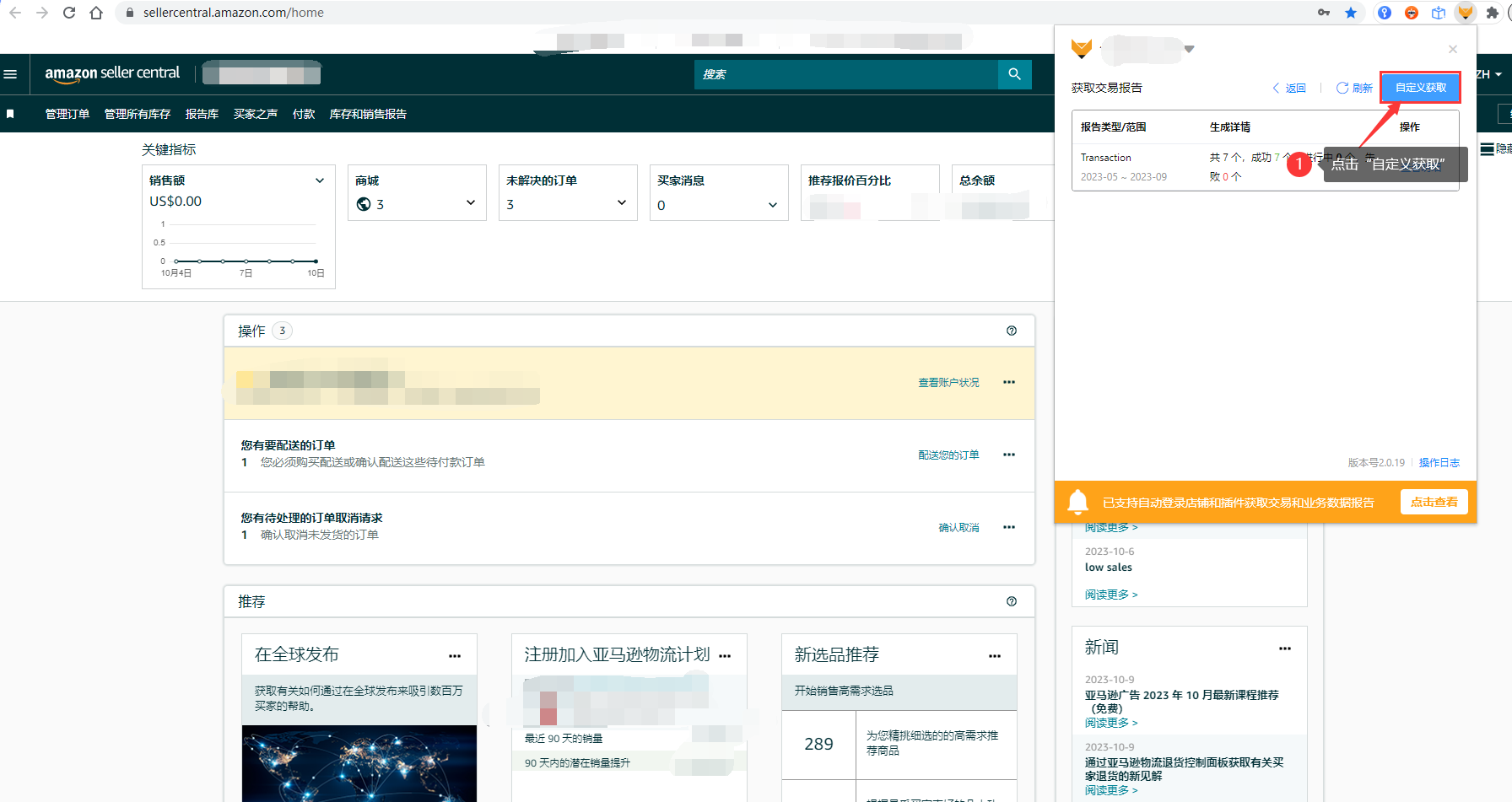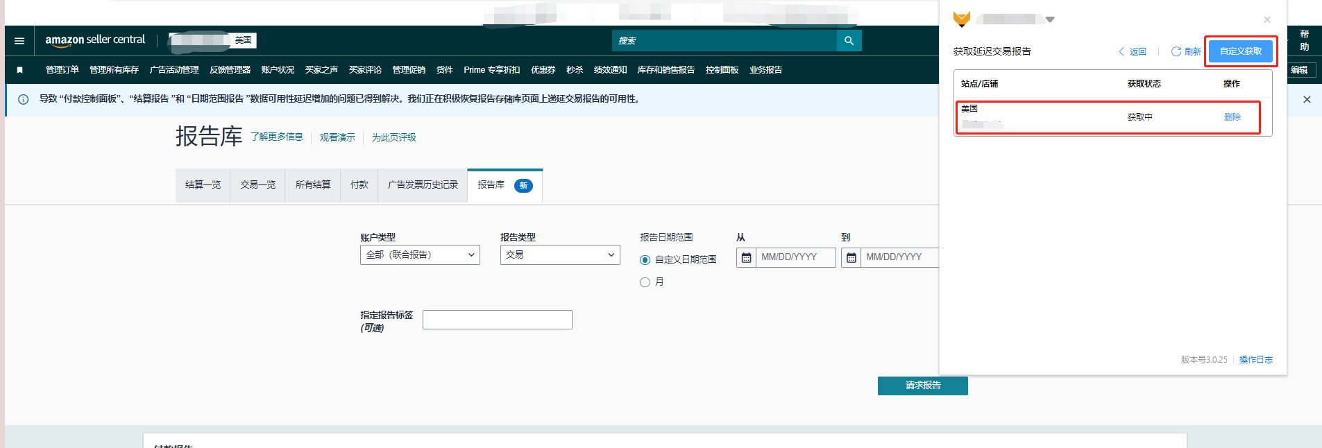 (2)点击自定义获取;注意:获取报告期间,请保持亚马逊后台在线。