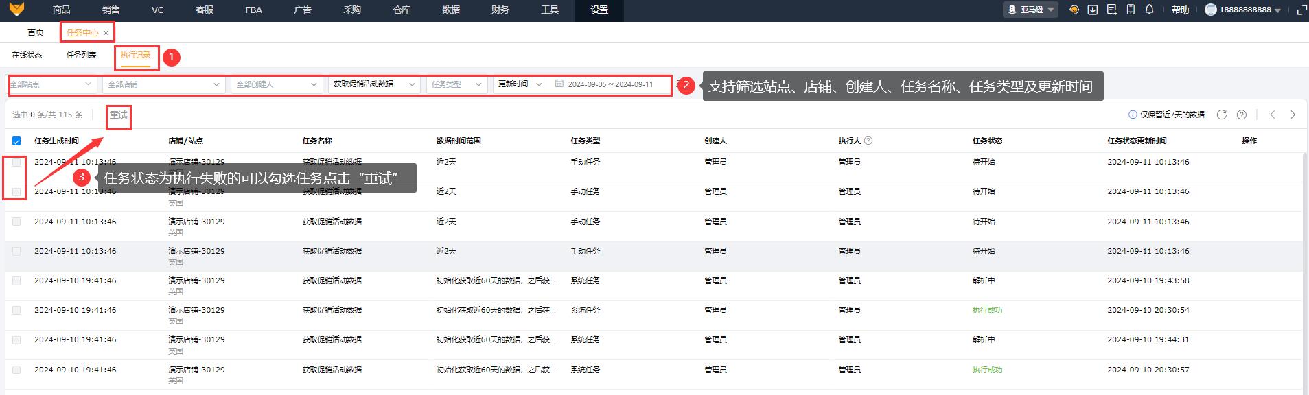 执行记录仅保留最近7天的数据,任务状态为执行失败的可以勾选任务重试。