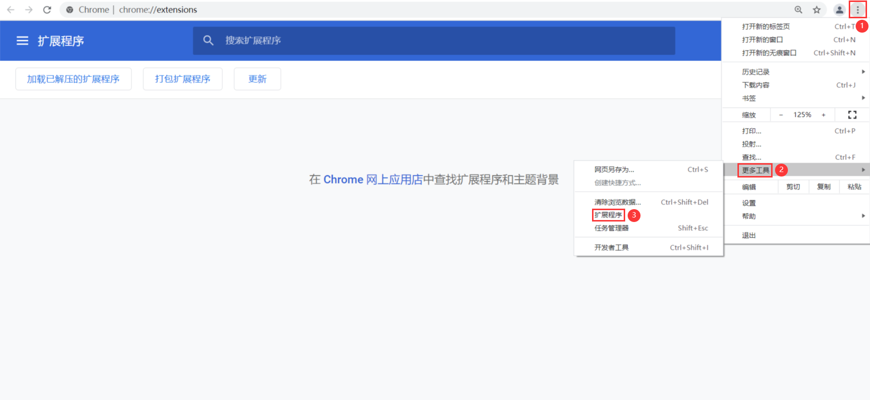 (2)打开谷歌操作说明, 点击右上角三点>【更多工具】>【扩展程序】页面;