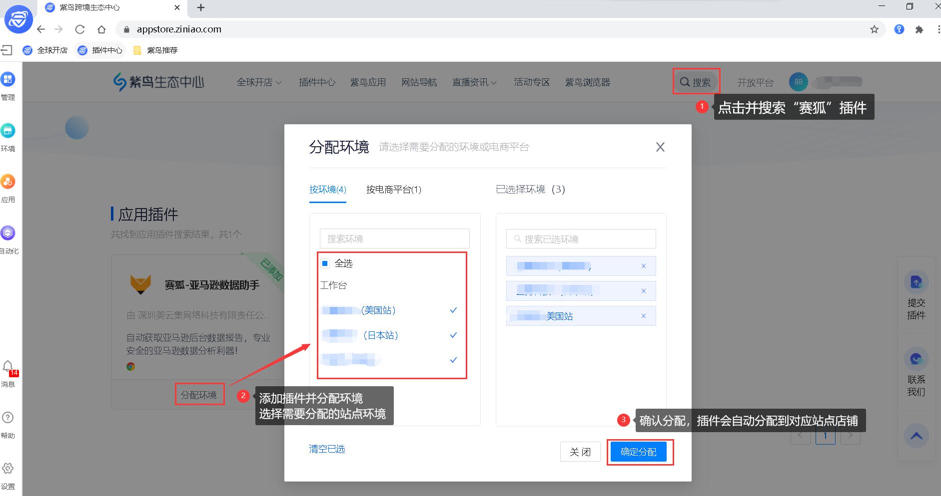 (3)分配环境,如有多个店铺,可以将插件多选分配店铺;