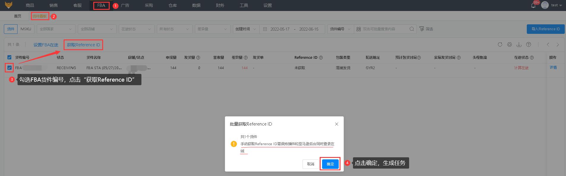若获取指定货件的Reference ID, 在【FBA】-【货件看板】勾选货件号和点击“获取Reference ID”按钮,手动生成任务;