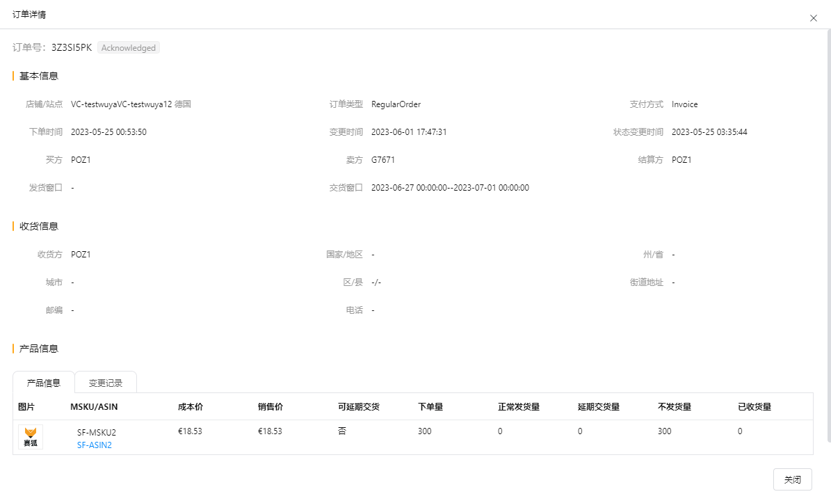 点击PO订单号可在弹窗中查看订单详情,支持查看产品信息和变更记录