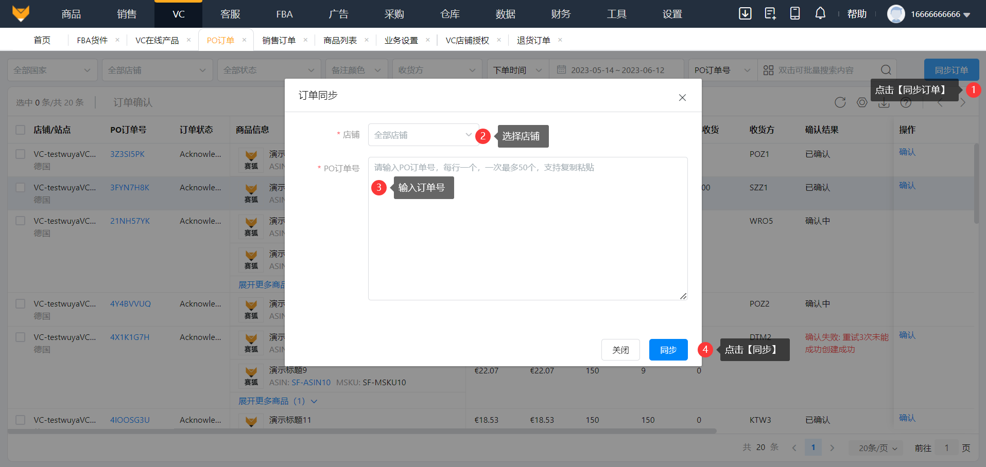 点击【同步订单】,选择需要同步的店铺,输入PO订单号,点击【同步】。