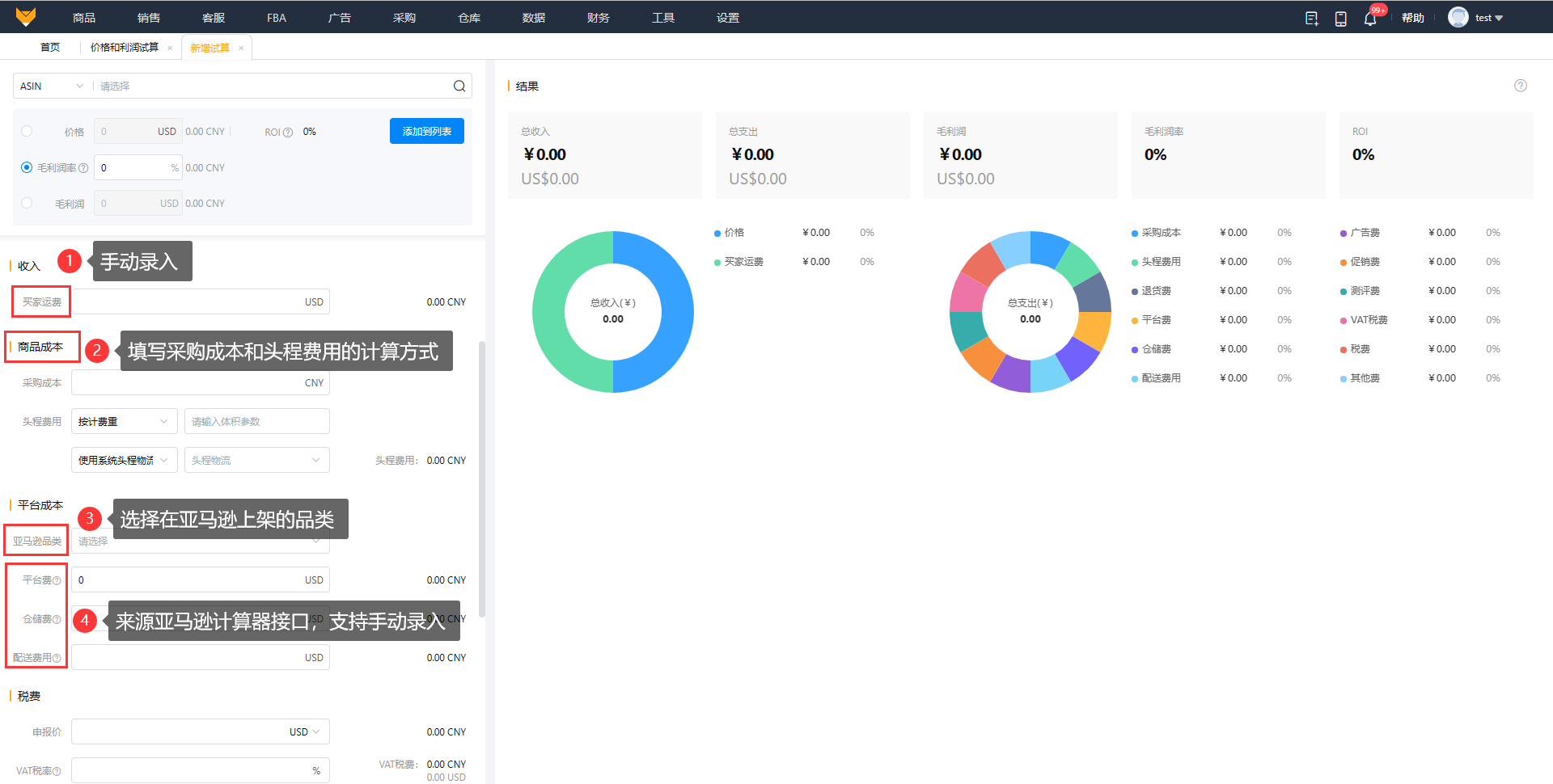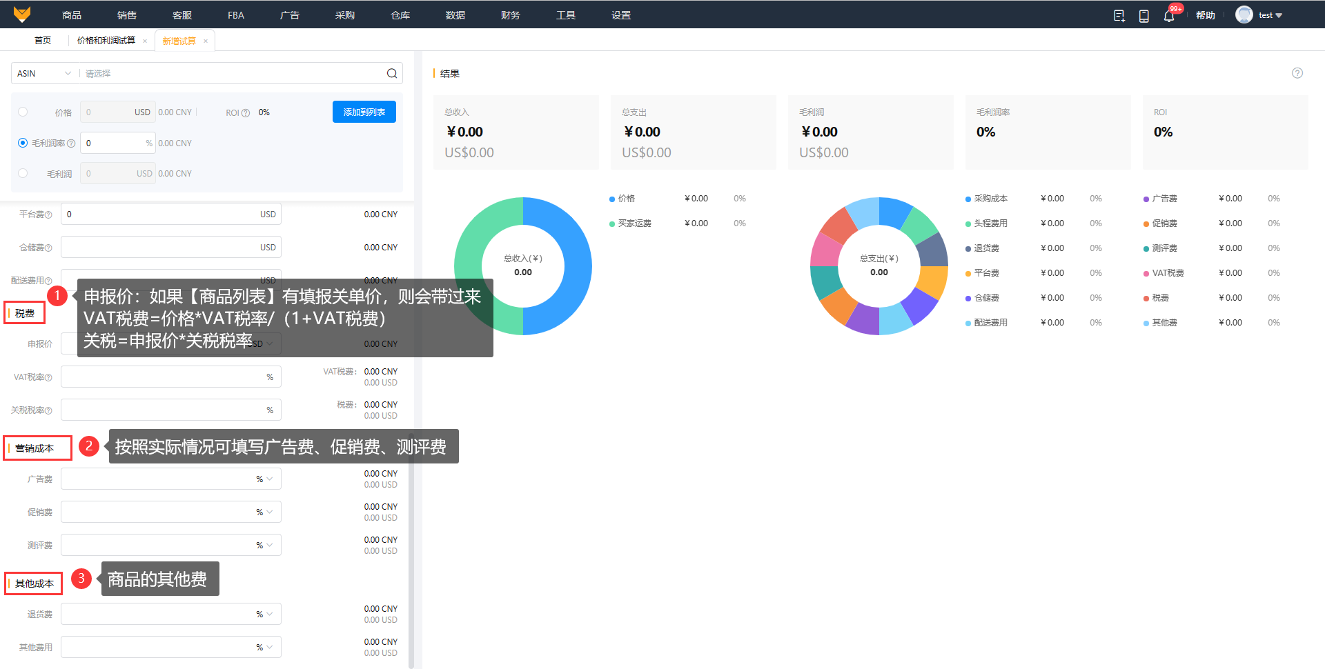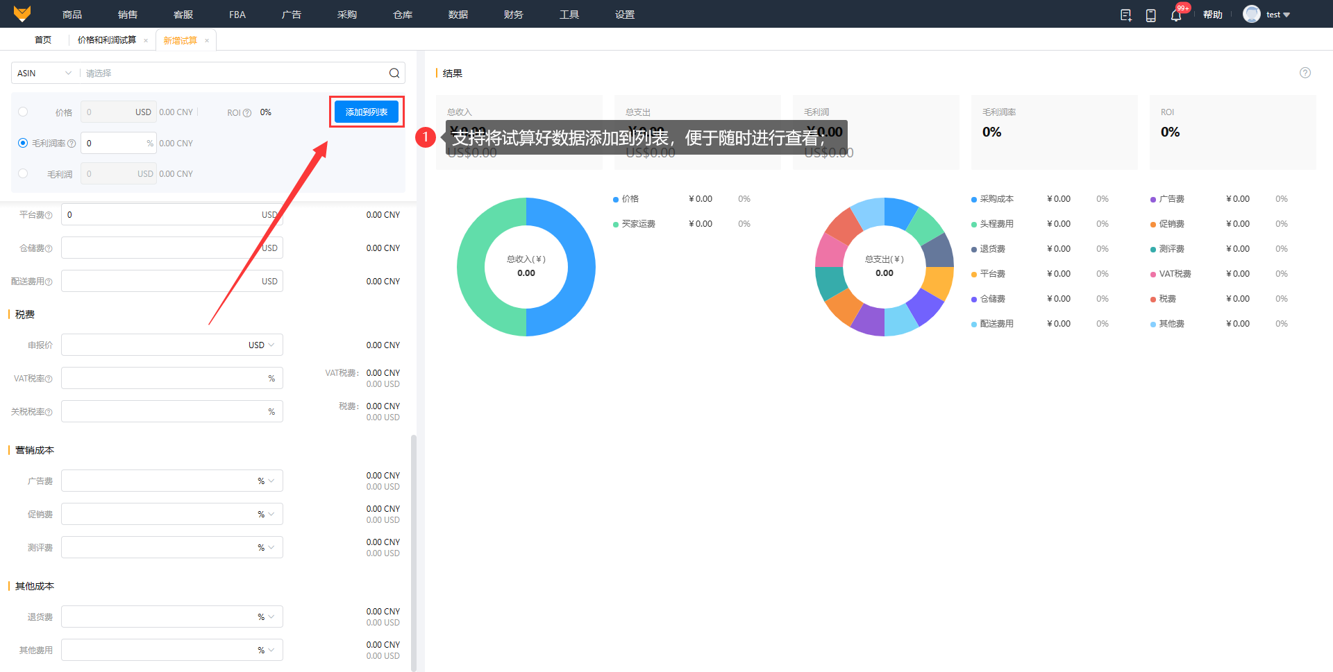 数据来源:在试算中基本信息、收入、商品成本、税费、营销成本和其他成本字段都是自定义填入的,平台成本字段则可以来源于亚马逊计算器也可以手动录入;