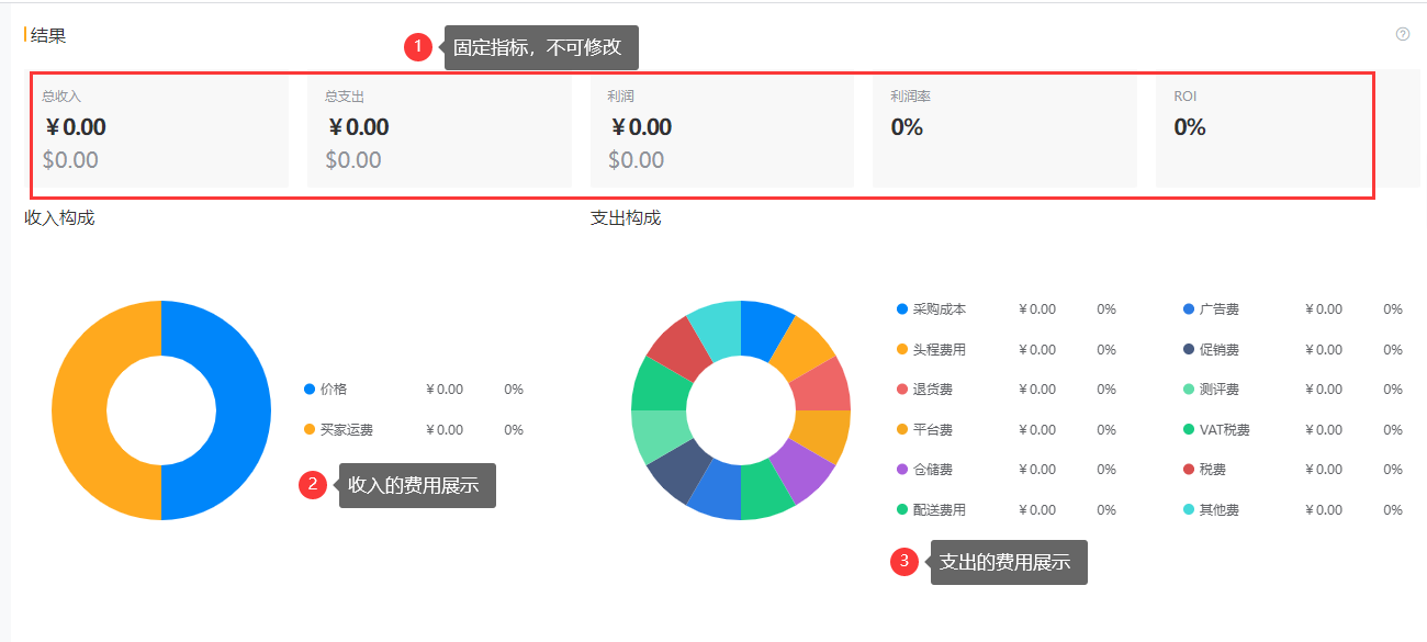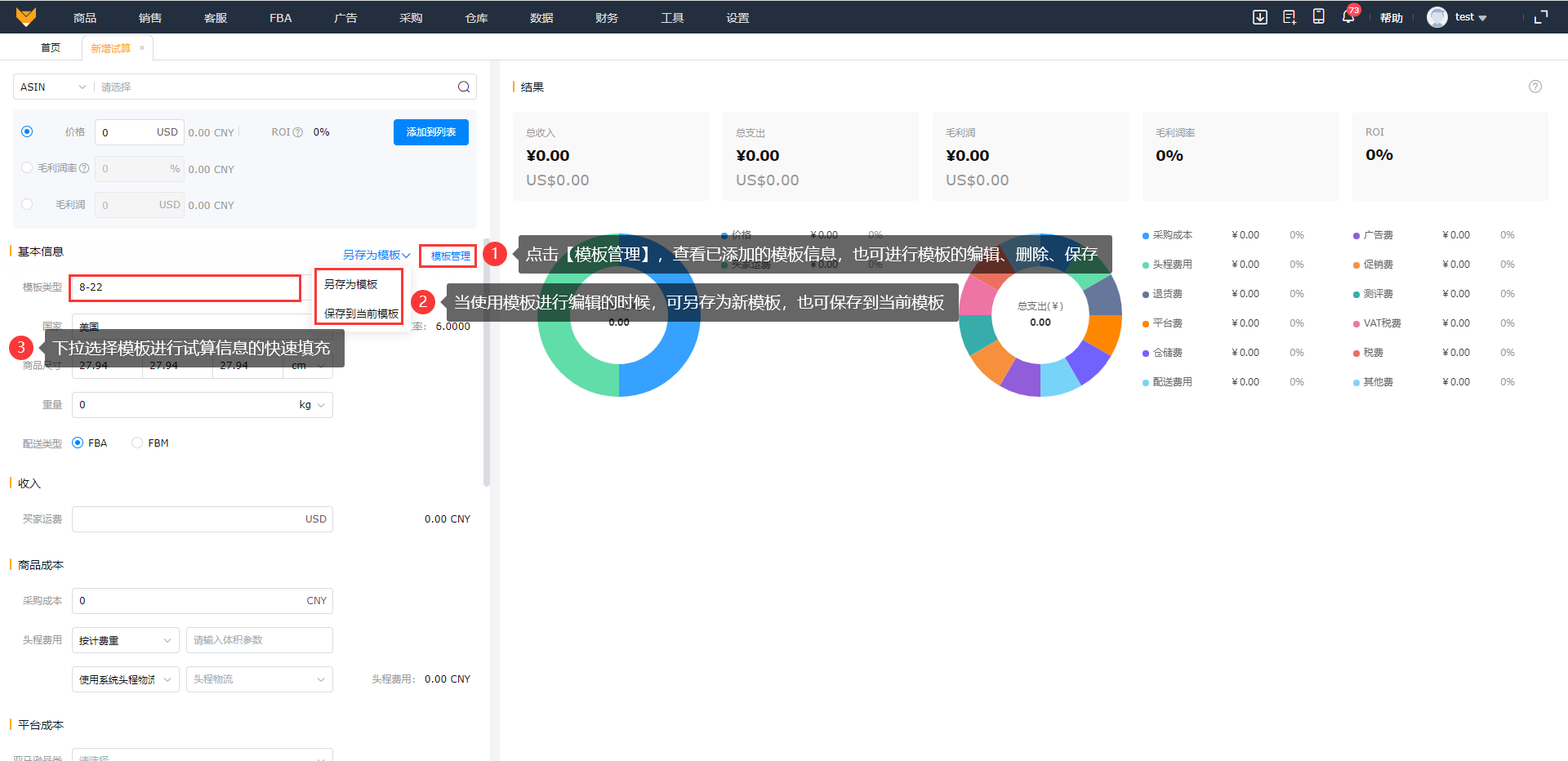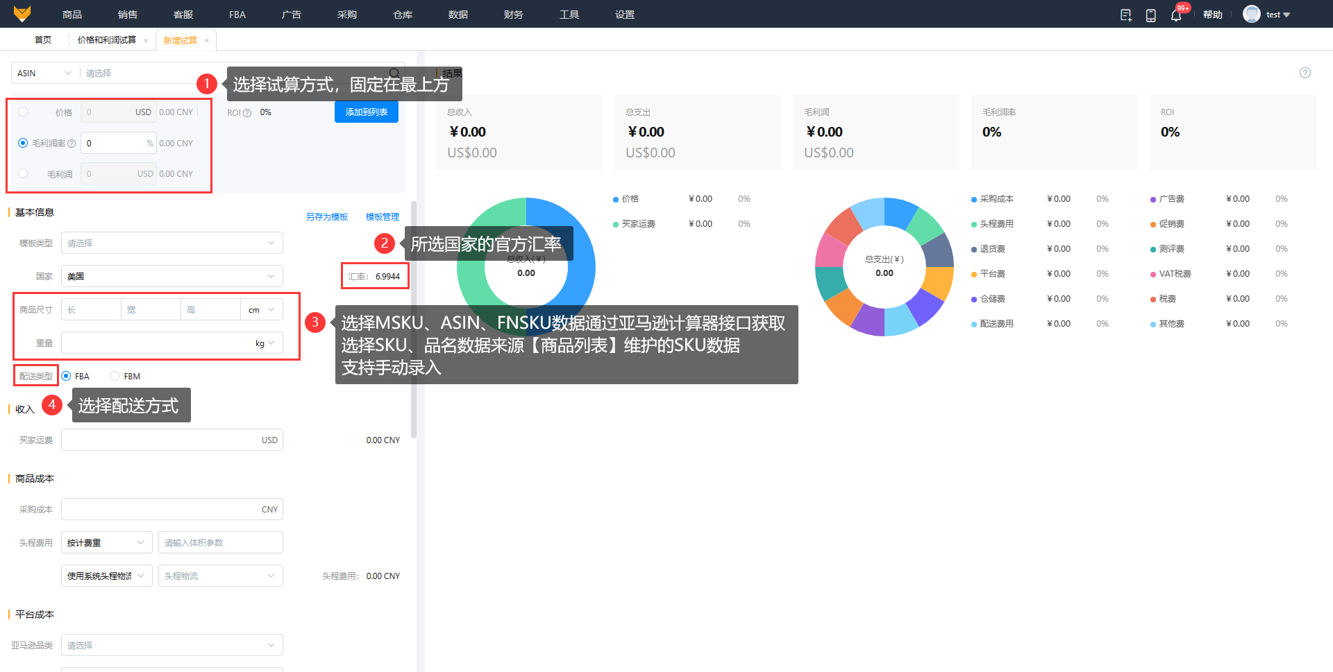 数据来源:在试算中基本信息、收入、商品成本、税费、营销成本和其他成本字段都是自定义填入的,平台成本字段则可以来源于亚马逊计算器也可以手动录入;