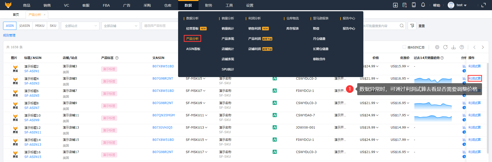 (3)入口3:【数据】>【产品分析】>【操作】>【利润试算】,产品数据异常时,可通过利润试算看是否需要调整商品价格。