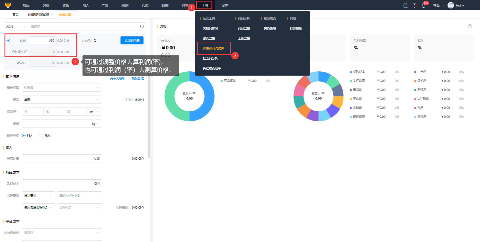 (1)可以通过利润率反算价格,或者测算定价的利润率,二者选其一,选择试算方式后填写商品基本信息。