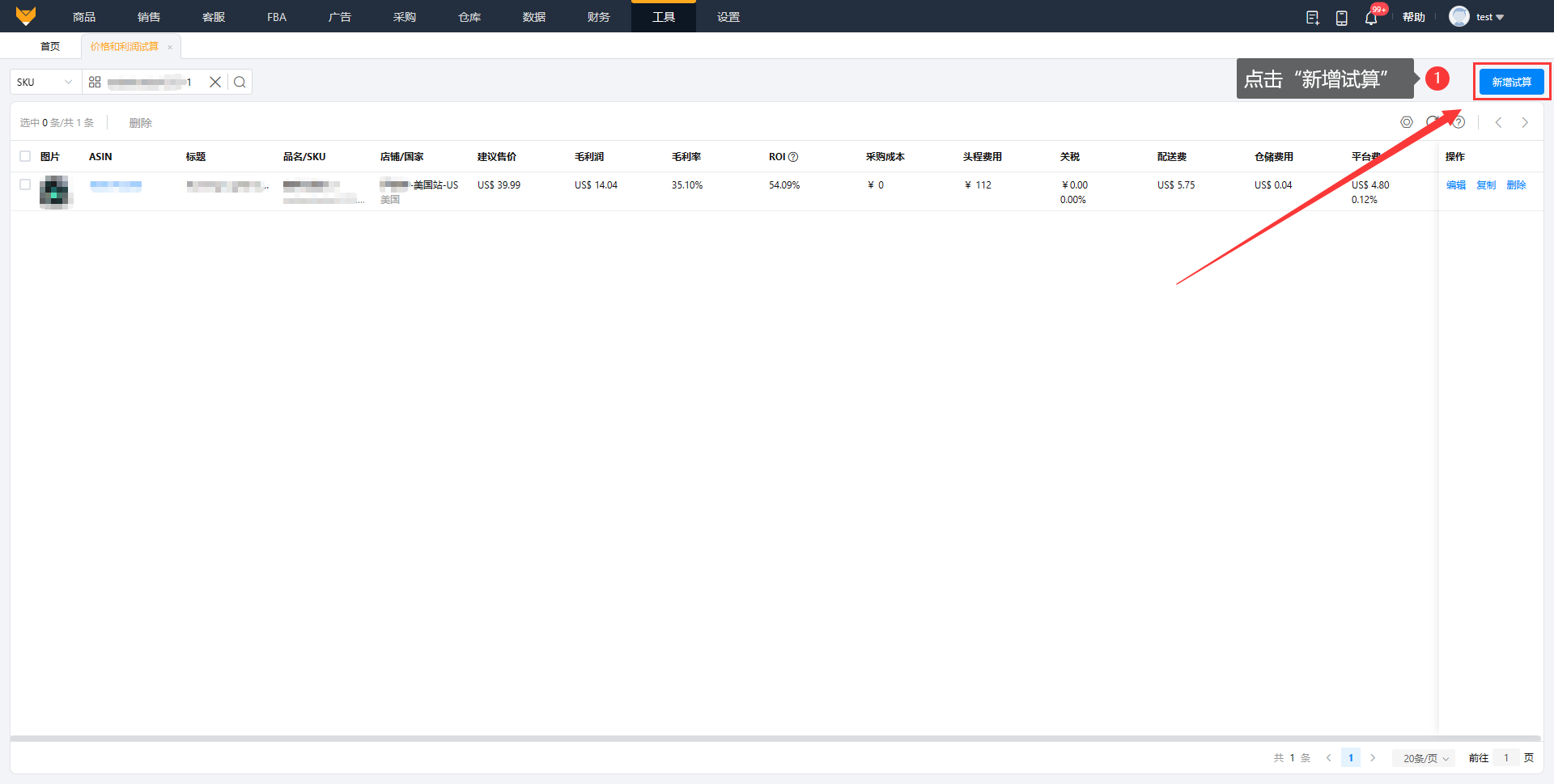 (1)入口1:【工具】>【价格和利润试算工具】,点击“新增试算”,可以通过调整价格或利润率来确定商品定价。